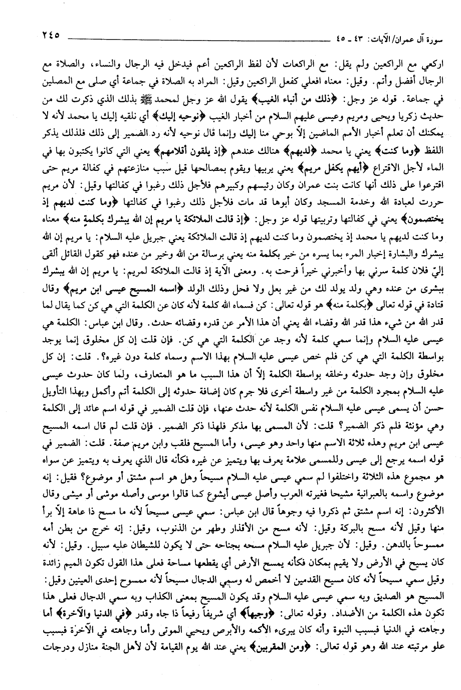 اركعي مع الراكعين ولم يقل: مع الراكعات لأن لفظ الراكعين أعم فيدخل فيه الرجال والنساء، والصلاة مع الرجال أفضل وأتم. وقيل: معناه افعلي كفعل الراكعين وقيل: المراد به الصلاة في جماعة أي صلى مع المصلين في جماعة. قوله عز وجل: ذلِكَ مِنْ أَنْباءِ الْغَيْبِ يقول الله عز وجل لمحمد صلّى الله عليه وسلّم بذلك الذي ذكرت لك من حديث زكريا ويحيى ومريم وعيسى عليهم السلام من أخبار الغيب نُوحِيهِ إِلَيْكَ أي نلقيه إليك يا محمد لأنه لا يمكنك أن تعلم أخبار الأمم الماضين إلّا بوحي منا إليك وإنما قال نوحيه لأنه رد الضمير إلى ذلك فلذلك يذكر اللفظ وَما كُنْتَ يعني يا محمد لَدَيْهِمْ هنالك عندهم إِذْ يُلْقُونَ أَقْلامَهُمْ يعني التي كانوا يكتبون بها في الماء لأجل الاقتراع أَيُّهُمْ يَكْفُلُ مَرْيَمَ يعني يربيها ويقوم بمصالحها قيل سبب منازعتهم في كفالة مريم حتى اقترعوا على ذلك أنها كانت بنت عمران وكان رئيسهم وكبيرهم فلأجل ذلك رغبوا في كفالتها وقيل: لأن مريم حررت لعبادة الله وخدمة المسجد وكان أبوها قد مات فلأجل ذلك رغبوا في كفالتها وَما كُنْتَ لَدَيْهِمْ إِذْ يَخْتَصِمُونَ يعني في كفالتها وتربيتها قوله عز وجل: إِذْ قالَتِ الْمَلائِكَةُ يا مَرْيَمُ إِنَّ اللَّهَ يُبَشِّرُكِ بِكَلِمَةٍ مِنْهُ معناه وما كنت لديهم يا محمد إذ يختصمون وما كنت لديهم إذ قالت الملائكة يعني جبريل عليه السلام: يا مريم إن الله يبشرك والبشارة إخبار المرء بما يسره من خير بكلمة منه يعني برسالة من الله وخير من عنده فهو كقول القائل ألقى إليّ فلان كلمة سرني بها وأخبرني خيرا فرحت به. ومعنى الآية إذ قالت الملائكة لمريم: يا مريم إن الله يبشرك ببشرى من عنده وهي ولد يولد لك من غير بعل ولا فحل وذلك الولد اسْمُهُ الْمَسِيحُ عِيسَى ابْنُ مَرْيَمَ وقال قتادة في قوله تعالى بِكَلِمَةٍ مِنْهُ هو قوله تعالى: كن فسماه الله كلمة لأنه كان عن الكلمة التي هي كن كما يقال لما قدر الله من شيء هذا قدر الله وقضاء الله يعني أن هذا الأمر عن قدره وقضائه حدث. وقال ابن عباس: الكلمة هي عيسى عليه السلام وإنما سمي كلمة لأنه وجد عن الكلمة التي هي كن. فإن قلت إن كل مخلوق إنما يوجد بواسطة الكلمة التي هي كن فلم خص عيسى عليه السلام بهذا الاسم وسماه كلمة دون غيره؟. قلت: إن كل مخلوق وإن وجد حدوثه وخلقه بواسطة الكلمة إلّا أن هذا السبب ما هو المتعارف، ولما كان حدوث عيسى عليه السلام بمجرد الكلمة من غير واسطة أخرى فلا جرم كان إضافة حدوثه إلى الكلمة أتم وأكمل وبهذا التأويل حسن أن يسمى عيسى عليه السلام نفس الكلمة لأنه حدث عنها، فإن قلت الضمير في قوله اسم عائد إلى الكلمة وهي مؤنثة فلم ذكر الضمير؟ قلت: لأن المسمى بها مذكر فلهذا ذكر الضمير. فإن قلت لم قال اسمه المسيح عيسى ابن مريم وهذه ثلاثة الاسم منها واحد وهو عيسى، وأما المسيح فلقب وابن مريم صفة. قلت: الضمير في قوله اسمه يرجع إلى عيسى وللمسمى علامة يعرف بها ويتميز عن غيره فكأنه قال الذي يعرف به ويتميز عن سواه هو مجموع هذه الثلاثة واختلفوا لم سمي عيسى عليه السلام مسيحا وهل هو اسم مشتق أو موضوع؟ فقيل: إنه موضوع واسمه بالعبرانية مشيحا فغيرته العرب وأصل عيسى أيشوع كما قالوا موسى وأصله موشى أو ميشى وقال الأكثرون: إنه اسم مشتق ثم ذكروا فيه وجوها قال ابن عباس: سمي عيسى مسيحا لأنه ما مسح ذا عاهة إلّا برأ منها