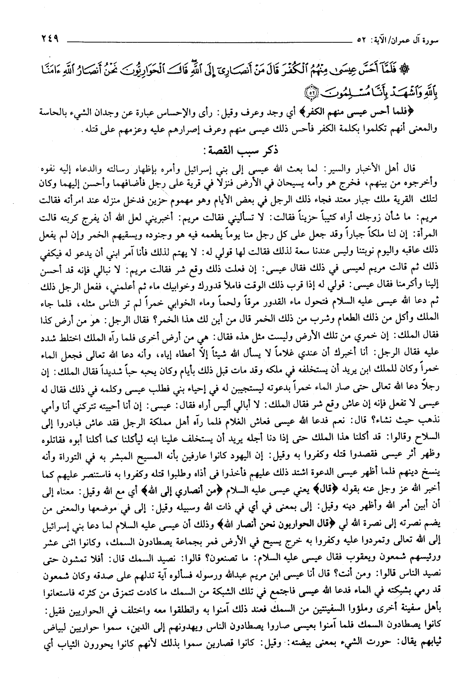 (ذكر سبب القصة:) قال أهل الأخبار والسير: لما بعث الله عيسى إلى بني إسرائيل وأمره بإظهار رسالته والدعاء إليه نفوه وأخرجوه من بينهم، فخرج هو وأمه يسيحان في الأرض فنزلا في قرية على رجل فأضافهما وأحسن إليهما وكان لتلك القرية ملك جبار معتد فجاء ذلك الرجل في بعض الأيام وهو مهموم حزين فدخل منزله عند امرأته فقالت مريم: ما شأن زوجك أراه كئيبا حزينا فقالت: لا تسأليني فقالت مريم: أخبريني لعل الله أن يفرج كربته قالت المرأة: إن لنا ملكا جبارا وقد جعل على كل رجل منا يوما يطعمه فيه هو وجنوده ويسقيهم الخمر وإن لم يفعل ذلك عاقبه واليوم نوبتنا وليس عندنا سعة لذلك فقالت لها قولي له: لا يهتم لذلك فأنا آمر ابني أن يدعو له فيكفي ذلك ثم قالت مريم لعيسى في ذلك فقال عيسى: إن فعلت ذلك وقع شر فقالت مريم: لا نبالي فإنه قد أحسن إلينا وأكرمنا فقال عيسى: قولي له إذا قرب ذلك الوقت فاملأ قدورك وخوابيك ماء ثم أعلمني، ففعل الرجل ذلك ثم دعا الله عيسى عليه السلام فتحول ماء القدور مرقا ولحما وماء الخوابي خمرا لم تر الناس مثله، فلما جاء الملك وأكل من ذلك الطعام وشرب من ذلك الخمر قال من أين لك هذا الخمر؟ فقال الرجل: هو من أرض كذا فقال الملك: إن خمري من تلك الأرض وليست مثل هذه فقال: هي من أرض أخرى فلما رآه الملك اختلط شدد عليه فقال الرجل: أنا أخبرك أن عندي غلاما لا يسأل الله شيئا إلّا أعطاه إياه، وأنه دعا الله تعالى فجعل الماء خمرا وكان للملك ابن يريد أن يستخلفه في ملكه وقد مات قبل ذلك بأيام وكان يحبه حبا شديدا فقال الملك: إن رجلا دعا الله تعالى حتى صار الماء خمرا بدعوته ليستجيبن له في إحياء بني فطلب عيسى وكلمه في ذلك فقال له عيسى لا تفعل فإنه إن عاش وقع شر فقال الملك: لا أبالي أليس أراه فقال: عيسى: إن أنا أحييته تتركني أنا وأمي نذهب حيث نشاء؟ قال: نعم فدعا الله عيسى فعاش الغلام فلما رآه أهل مملكة الرجل فقد عاش فبادروا إلى السلاح وقالوا: قد أكلنا هذا الملك حتى إذا دنا أجله يريد أن يستخلف علينا ابنه ليأكلنا كما أكلنا أبوه فقاتلوه وظهر أثر عيسى فقصدوا قتله وكفروا به وقيل: إن اليهود كانوا عارفين بأنه المسيح المبشر به في التوراة وأنه ينسخ دينهم فلما أظهر عيسى الدعوة اشتد ذلك عليهم فأخذوا في أذاه وطلبوا قتله وكفروا به فاستنصر عليهم كما أخبر الله عز وجل عنه بقوله قالَ يعني عيسى عليه السلام مَنْ أَنْصارِي إِلَى اللَّهِ أي مع الله وقيل: معناه إلى أن أبين أمر الله وأظهر دينه وقيل: إلى بمعنى في أي في ذات الله وسبيله وقيل: إلى في موضعها والمعنى من يضم نصرته إلى نصرة الله لي قالَ الْحَوارِيُّونَ نَحْنُ أَنْصارُ اللَّهِ وذلك أن عيسى عليه السلام لما دعا بني إسرائيل إلى الله تعالى وتمردوا عليه وكفروا به خرج يسيح في الأرض فمر بجماعة يصطادون السمك، وكانوا اثنى عشر ورئيسهم شمعون ويعقوب فقال عيسى عليه السلام: ما تصنعون؟ قالوا: نصيد السمك قال: أفلا تمشون حتى نصيد الناس قالوا: ومن أنت؟ قال أنا عيسى ابن مريم عبد الله ورسوله فسألوه آية تدلهم على صدقه وكان شمعون قد رمي بشبكته في الماء فدعا الله عيسى فاجتمع في تلك الشبكة من السمك ما كادت تتمزق من كثرته فاستعانوا بأهل سفينة أخرى وملؤوا السفينتين من السمك فعند ذلك آمنوا به وانطلقوا معه واختلف في الحواريين فقيل:
