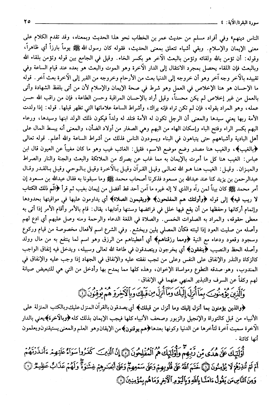 الناس دينهم» وفي أفراد مسلم من حديث عمر بن الخطاب نحو هذا الحديث وبمعناه، وقد تقدم الكلام على معنى الإيمان والإسلام. وبقي أشياء تتعلق بمعنى الحديث، فقوله كان رسول الله صلّى الله عليه وسلّم يوما بارزا أي ظاهرا، وقوله: أن تؤمن بالله ولقائه وتؤمن بالبعث الآخر هو بكسر الخاء. وقيل في الجامع بين قوله وتؤمن بلقاء الله وبالبعث فإن اللقاء يحصل بمجرد الانتقال إلى الدار الآخرة وهو الموت والبعث هو بعده عند قيام الساعة وفي تقييده بالآخر وجه آخر وهو أن خروجه إلى الدنيا بعث من الأرحام وخروجه من القبر إلى الآخرة بعث آخر. قوله ما الإحسان هو هنا الإخلاص في العمل وهو شرط في صحة الإيمان والإسلام لأن من أتى بلفظ الشهادة وأتى بالعمل من غير إخلاص لم يكن محسنا، وقيل أراد بالإحسان المراقبة وحسن الطاعة، فإن من راقب الله حسن عمله، وهو المراد بقوله، فإن لم تكن تراه فإنه يراك، وأشراط الساعة علاماتها التي تظهر قبلها. قوله: إذا ولدت الأمة ربها يعني سيدها والمعنى أن الرجل تكون له الأمة فتلد له ولدا فيكون ذلك الولد ابنها وسيدها، ورعاء البهم بكسر الراء وفتح الباء وإسكان الهاء من البهم وهي الصغار من أولاد الضأن، والمعنى أنه يبسط المال على أهل البادية وأشباههم حتى يتباهون في البناء ويسودون الناس فذلك من أشراط الساعة والله أعلم. قوله تعالى بِالْغَيْبِ، والغيب هنا مصدر وضع موضع الاسم، فقيل: الغائب غيب وهو ما كان مغيبا عن العيون قال ابن عباس: الغيب هنا كل ما أمرت بالإيمان به مما غاب عن بصرك من الملائكة والبعث والجنة والنار والصراط والميزان. وقيل: الغيب هنا هو الله تعالى وقيل القرآن وقيل بالآخرة وقيل بالوحي وقيل بالقدر وقال عبد الرحمن بن يزيد كنا عند عبد الله بن مسعود فذكرنا أصحاب محمد صلّى الله عليه وسلّم وما سبقونا به فقال عبد الله بن مسعود إن أمر محمد صلّى الله عليه وسلّم كان بينا لمن رآه والذي لا إله غيره ما آمن أحد قط أفضل من إيمان بغيب ثم قرأ الم ذلِكَ الْكِتابُ لا رَيْبَ فِيهِ إلى قوله وَأُولئِكَ هُمُ الْمُفْلِحُونَ وَيُقِيمُونَ الصَّلاةَ أي يداومون عليها في مواقيتها بحدودها وإتمام أركانها وحفظها من أن يقع فيها خلل في فرائضها وسنتها وآدابها، يقال: قام بالأمر وأقام الأمر إذا أتى به معطى حقوقه، والمراد به الصلوات الخمس. والصلاة في اللغة الدعاء والرحمة ومنه وصل عليهم أي ادع لهم وأصله من صليت العود إذا لينته فكأن المصلي يلين ويخشع. وفي الشرع اسم لأفعال مخصوصة من قيام وركوع وسجود وقعود ودعاء مع النية وَمِمَّا رَزَقْناهُمْ أي أعطيناهم من الرزق وهو اسم لما ينتفع به من مال وولد