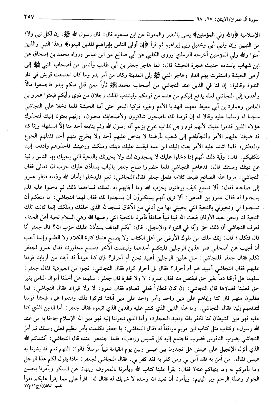 الإسلامية وَاللَّهُ وَلِيُّ الْمُؤْمِنِينَ يعني بالنصر والمعونة عن ابن مسعود قال: قال رسول الله صلّى الله عليه وسلّم: إن لكل نبي ولاة من النبيين وإن وليي أبي وخليل ربي إبراهيم ثم قرأ إِنَّ أَوْلَى النَّاسِ بِإِبْراهِيمَ لَلَّذِينَ اتَّبَعُوهُ وهذا النبي والذين آمنوا والله ولي المؤمنين أخرجه الترمذي وروى الكلبي عن أبي صالح عن ابن عباس ورواه محمد بن إسحاق عن ابن شهاب بإسناده حديث هجرة الحبشة قال: لما هاجر جعفر بن أبي طالب وأناس من أصحاب النبي صلّى الله عليه وسلّم إلى أرض الحبشة واستقرت بهم الدار وهاجر النبي صلّى الله عليه وسلّم إلى المدينة وكان من أمر بدر وما كان اجتمعت قريش في دار الندوة وقالوا: إن لنا في الذين عند النجاشي من أصحاب محمد صلّى الله عليه وسلّم ثأرا ممن قتل منكم ببدر فاجمعوا مالا وأهدوه إلى النجاشي لعله يدفع إليكم من عنده من قومكم ولينتدب لذلك رجلان من ذوي رأيكم فبعثوا عمرو بن العاص وعمارة بن أبي معيط معهما الهدايا الأدم وغيره فركبا البحر حتى أتيا الحبشة فلما دخلا على النجاشي سجدا له وسلما عليه وقالا له إن قومنا لك ناصحون شاكرون ولأصحابك محبون، وإنهم بعثونا إليك لنحذرك هؤلاء الذين قدموا عليك لأنهم قوم رجل كذاب خرج يزعم أنه رسول الله ولم يتابعه أحد منا إلّا السفهاء وإنا كنا قد ضيقنا عليهم الأمر وألجأناهم إلى شعب بأرضنا لا يدخل عليهم أحد ولا يخرج منهم أحد فقتلهم الجوع والعطش، فلما اشتد عليه الأمر بعث إليك ابن عمه ليفسد عليك دينك وملكك ورعيتك فاحذرهم وادفعهم إلينا لنكفيكم. قال: وآية ذلك أنهم إذا دخلوا عليك لا يسجدون لك ولا يحيونك بالتحية التي يحييك بها الناس رغبة عن دينك وسنتك قال: فدعاهم النجاشي فلما حضروا صاح جعفر بالباب يستأذن عليك حزب الله تعالى فقال النجاشي: مروا هذا الصائح فليعد كلامه ففعل جعفر فقال النجاشي: نعم فليدخلوا بأمان الله وذمته فنظر عمرو إلى صاحبه فقال: ألا تسمع كيف يرطنون بحزب الله وما أجابهم به الملك فساءهما ذلك ثم دخلوا عليه فلم يسجدوا له فقال عمرو بن العاص: ألا ترى أنهم يستكبرون أن يسجدوا لك فقال لهما النجاشي: ما منعكم أن تسجدوا لي وتحيوني بالتحية التي يحييني بها من أتاني من الآفاق نسجد لله الذي خلقك وملكك إنما كانت تلك التحية لنا ونحن نعبد الأوثان فبعث الله فينا نبيا صادقا فأمرنا بالتحية التي رضيها الله وهي السلام تحية أهل الجنة، فعرف النجاشي أن ذلك حق وأنه في التوراة والإنجيل. قال: أيكم الهاتف يستأذن عليك حزب الله؟ قال جعفر أنا قال فتكلم قال: إنك ملك من ملوك الأرض من أهل الكتاب ولا يصلح عندك كثرة الكلام ولا الظلم وإنما أحب أن أجيب عن أصحابي فمر هذين الرجلين فليتكلم أحدهما ولينصت الآخر فتسمع محاورتنا فقال عمرو لجعفر تكلم فقال جعفر للنجاشي: سل هذين الرجلين أعبيد نحن أم أحرار؟ فإن كنا عبيدا قد أبقنا من أربابنا فردنا عليهم فقال النجاشي أعبيد هم أم أحرار؟ فقال بل أحرار كرام فقال النجاشي: نجوا من العبودية فقال جعفر: