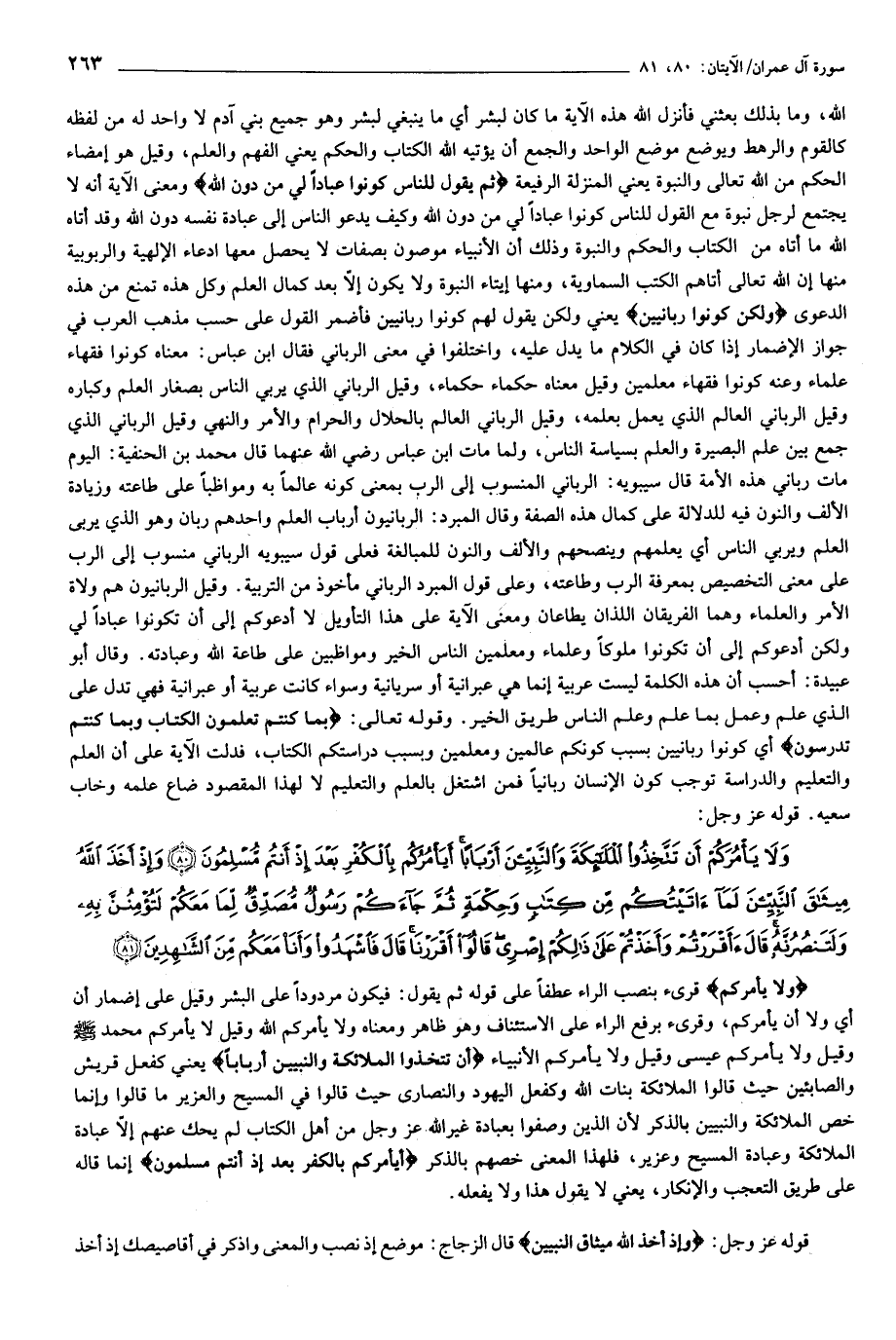 وَلا يَأْمُرَكُمْ أَنْ تَتَّخِذُوا الْمَلائِكَةَ وَالنَّبِيِّينَ أَرْباباً أَيَأْمُرُكُمْ بِالْكُفْرِ بَعْدَ إِذْ أَنْتُمْ مُسْلِمُونَ (80) وَإِذْ أَخَذَ اللَّهُ مِيثاقَ النَّبِيِّينَ لَما آتَيْتُكُمْ مِنْ كِتابٍ وَحِكْمَةٍ ثُمَّ جاءَكُمْ رَسُولٌ مُصَدِّقٌ لِما مَعَكُمْ لَتُؤْمِنُنَّ بِهِ وَلَتَنْصُرُنَّهُ قالَ أَأَقْرَرْتُمْ وَأَخَذْتُمْ عَلى ذلِكُمْ إِصْرِي قالُوا أَقْرَرْنا قالَ فَاشْهَدُوا وَأَنَا مَعَكُمْ مِنَ الشَّاهِدِينَ (81)