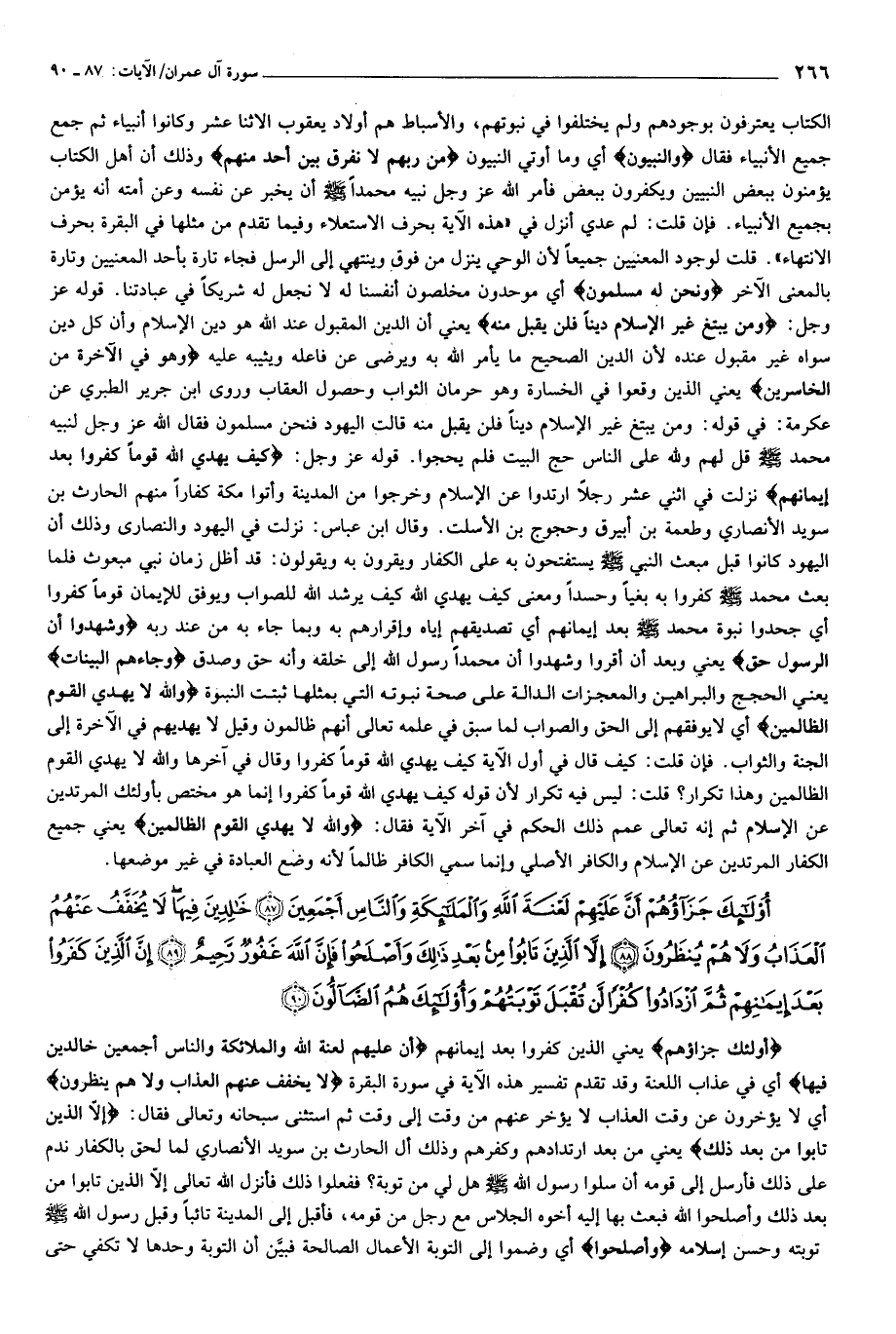 أُولئِكَ جَزاؤُهُمْ أَنَّ عَلَيْهِمْ لَعْنَةَ اللَّهِ وَالْمَلائِكَةِ وَالنَّاسِ أَجْمَعِينَ (87) خالِدِينَ فِيها لا يُخَفَّفُ عَنْهُمُ الْعَذابُ وَلا هُمْ يُنْظَرُونَ (88) إِلاَّ الَّذِينَ تابُوا مِنْ بَعْدِ ذلِكَ وَأَصْلَحُوا فَإِنَّ اللَّهَ غَفُورٌ رَحِيمٌ (89) إِنَّ الَّذِينَ كَفَرُوا بَعْدَ إِيمانِهِمْ ثُمَّ ازْدادُوا كُفْراً لَنْ تُقْبَلَ تَوْبَتُهُمْ وَأُولئِكَ هُمُ الضَّالُّونَ (90)