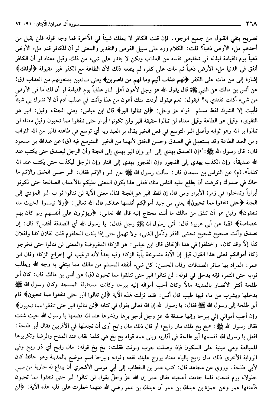 تصريح بنفي القبول من جميع الوجوه. فإن قلت الكافر لا يملك شيئا في الآخرة فما وجه قوله فلن يقبل من أحدهم ملء الأرض ذهبا؟ قلت: الكلام ورد على سبيل الفرض والتقدير والمعنى لو أن للكافر قدر ملء الأرض ذهبا يوم القيامة لبذله في تخليص نفسه من العذاب ولكن لا يقدر على شيء من ذلك وقيل معناه لو أن الكافر أنفق في الدنيا ملء الأرض ذهبا ثم مات على كفره لم ينفعه ذلك لأن الطاعة مع الكفر غير مقبولة أُولئِكَ إشارة إلى من مات على الكفر لَهُمْ عَذابٌ أَلِيمٌ وَما لَهُمْ مِنْ ناصِرِينَ يعني مانعين يمنعونهم من العذاب (ق) عن أنس بن مالك عن النبي صلّى الله عليه وسلّم قال يقول الله عز وجل لأهون أهل النار عذابا يوم القيامة لو أن لك ما في الأرض من شيء أكنت تفتدي به؟ فيقول: نعم فيقول أردت منك أهون من هذا وأنت في صلب آدم أن لا تشرك بي شيئا فأبيت إلا الشرك لفظ مسلم. قوله عز وجل: لَنْ تَنالُوا الْبِرَّ قال ابن عباس: يعني الجنة، وقيل: البر هو التقوى، وقيل هو الطاعة وقيل معناه لن تنالوا حقيقة البر ولن تكونوا أبرار حتى تنفقوا مما تحبون وقيل معناه لن تنالوا بر الله وهو ثوابه وأصل البر التوسع في فعل الخير يقال بر العبد ربه أي توسع في طاعته فالبر من الله الثواب ومن العبد الطاعة وقد يستعمل في الصدق وحسن الخلق لأنهما من الخير المتوسع فيه (ق) عن عبد الله بن مسعود قال: قال رسول الله صلّى الله عليه وسلّم: «إن الصدق يهدي إلى البر وإن البر يهدي إلى الجنة وأن الرجل ليصدق حتى يكتب عند الله صديقا، وإن الكذب يهدي إلى الفجور وإن الفجور يهدي إلى النار وإن الرجل ليكذب حتى يكتب عند الله كذابا». (م) عن النواس بن سمعان قال: سألت رسول الله صلّى الله عليه وسلّم عن البر والإثم فقال: البر حسن الخلق والإثم ما حاك في صدرك وكرهت أن يطلع عليه الناس منك فعلى هذا يكون المعنى عليكم بالأعمال الصالحة حتى تكونوا أبرارا وتدخلوا في زمرة الأبرار ومن قال إن لفظ البر هو الجنة فقال معنى الآية لن تنالوا ثواب البر المؤدي إلى الجنة حَتَّى تُنْفِقُوا مِمَّا تُحِبُّونَ يعني من جيد أموالكم أنفسها عندكم قال الله تعالى: وَلا تَيَمَّمُوا الْخَبِيثَ مِنْهُ تُنْفِقُونَ وقيل هو أن تنفق من مالك ما أنت محتاج إليه قال الله تعالى: وَيُؤْثِرُونَ عَلى أَنْفُسِهِمْ وَلَوْ كانَ بِهِمْ خَصاصَةٌ (ق) عن أبي هريرة قال: أتى رسول الله صلّى الله عليه وسلّم رجل فقال: يا رسول الله أي الصدقة أفضل؟ قال: إن تصدق وأنت صحيح شحيح تخشى الفقر وتأمل الغنى، ولا تهمل حتى إذا بلغت الحلقوم قلت لفلان كذا ولفلان كذا إلّا وقد كان، واختلفوا في هذا الإنفاق قال ابن عباس: هو الزكاة المفروضة والمعنى لن تنالوا حتى تخرجوا زكاة أموالكم فعلى هذا القول قيل إن الآية منسوخة بآية الزكاة وفيه بعدا لأنه ترغيب في إخراج الزكاة وقال ابن عمر: المراد بها سائر الصدقات وقال الحسن: كل شيء أنفقه المسلم من مالك مما يبتغي به وجه الله ويطلب ثوابه حتى التمرة فإنه يدخل في قوله: لن تنالوا البر حتى تنفقوا مما تحبون (ق) عن أنس بن مالك قال: كان أبو طلحة أكثر الأنصار بالمدينة مالا وكان أحب أمواله إليه بيرحا وكانت مستقبلة المسجد وكان رسول الله صلّى الله عليه
