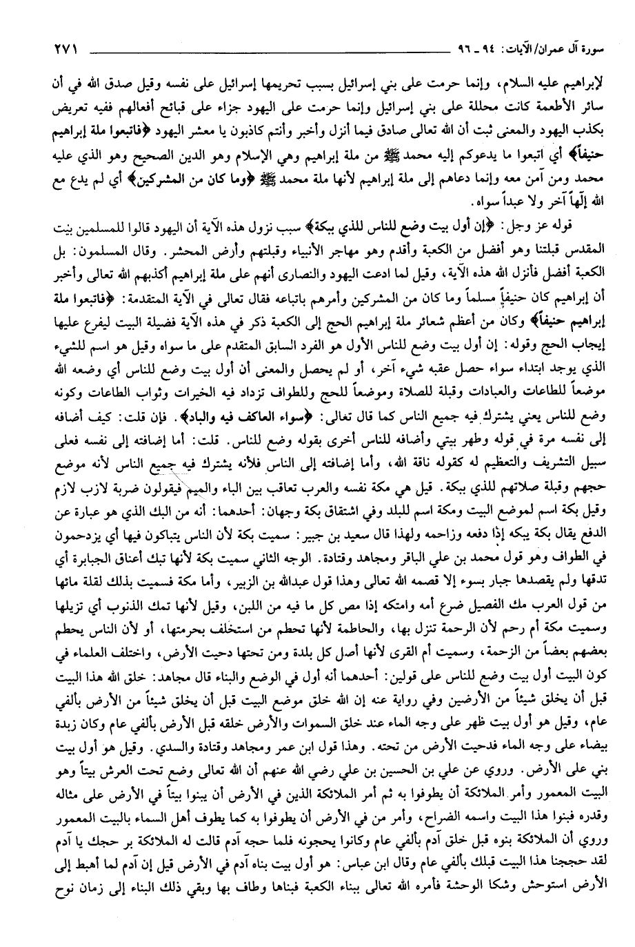 قوله عز وجل: إِنَّ أَوَّلَ بَيْتٍ وُضِعَ لِلنَّاسِ لَلَّذِي بِبَكَّةَ سبب نزول هذه الآية أن اليهود قالوا للمسلمين بيت المقدس قبلتنا وهو أفضل من الكعبة وأقدم وهو مهاجر الأنبياء وقبلتهم وأرض المحشر. وقال المسلمون: بل الكعبة أفضل فأنزل الله هذه الآية، وقيل لما ادعت اليهود والنصارى أنهم على ملة إبراهيم أكذبهم الله تعالى وأخبر أن إبراهيم كان حنيفا مسلما وما كان من المشركين وأمرهم باتباعه فقال تعالى في الآية المتقدمة: فَاتَّبِعُوا مِلَّةَ إِبْراهِيمَ حَنِيفاً وكان من أعظم شعائر ملة إبراهيم الحج إلى الكعبة ذكر في هذه الآية فضيلة البيت ليفرع عليها إيجاب الحج وقوله: إن أول بيت وضع للناس الأول هو الفرد السابق المتقدم على ما سواه وقيل هو اسم للشيء الذي يوجد ابتداء سواء حصل عقبه شيء آخر، أو لم يحصل والمعنى أن أول بيت وضع للناس أي وضعه الله موضعا للطاعات والعبادات وقبلة للصلاة وموضعا للحج وللطواف تزداد فيه الخيرات وثواب الطاعات وكونه وضع للناس يعني يشترك فيه جميع الناس كما قال تعالى: سَواءً الْعاكِفُ فِيهِ وَالْبادِ. فإن قلت: كيف أضافه إلى نفسه مرة في قوله وطهر بيتي وأضافه للناس أخرى بقوله وضع للناس. قلت: أما إضافته إلى نفسه فعلى سبيل التشريف والتعظيم له كقوله ناقة الله، وأما إضافته إلى الناس فلأنه يشترك فيه جميع الناس لأنه موضع حجهم وقبلة صلاتهم للذي ببكة. قيل هي مكة نفسه والعرب تعاقب بين الباء والميم فيقولون ضربة لازب لازم وقيل بكة اسم لموضع البيت ومكة اسم للبلد وفي اشتقاق بكة وجهان: أحدهما: أنه من البك الذي هو عبارة عن الدفع يقال بكه يبكه إذا دفعه وزاحمه ولهذا قال سعيد بن جبير: سميت بكة لأن الناس يتباكون فيها أي يزدحمون في الطواف وهو قول محمد بن علي الباقر ومجاهد وقتادة. الوجه الثاني سميت بكة لأنها تبك أعناق الجبابرة أي تدقها ولم يقصدها جبار بسوء إلا قصمه الله تعالى وهذا قول عبد الله بن الزبير، وأما مكة فسميت بذلك لقلة مائها من قول العرب مك الفصيل ضرع أمه وامتكه إذا مص كل ما فيه من اللبن، وقيل لأنها تمك الذنوب أي تزيلها وسميت مكة أم رحم لأن الرحمة تنزل بها، والحاطمة لأنها تحطم من استخلف بحرمتها، أو لأن الناس يحطم بعضهم بعضا من الزحمة، وسميت أم القرى لأنها أصل كل بلدة ومن تحتها دحيت الأرض، واختلف العلماء في كون البيت أول بيت وضع للناس على قولين: أحدهما أنه أول في الوضع والبناء قال مجاهد: خلق الله هذا البيت قبل أن يخلق شيئا من الأرضين وفي رواية عنه إن الله خلق موضع البيت قبل أن يخلق شيئا من الأرض بألفي عام، وقيل هو أول بيت ظهر على وجه الماء عند خلق السموات والأرض خلقه قبل الأرض بألفي عام وكان زبدة بيضاء على وجه الماء فدحيت الأرض من تحته. وهذا قول ابن عمر ومجاهد وقتادة والسدي. وقيل هو أول بيت بني على الأرض. وروي عن علي بن الحسين بن علي رضي الله عنهم أن الله تعالى وضع تحت العرش بيتا وهو البيت المعمور وأمر الملائكة أن يطوفوا به ثم أمر الملائكة الذين في الأرض أن يبنوا بيتا في الأرض على مثاله وقدره فبنوا هذا البيت واسمه الضراح، وأمر من في الأرض أن يطوفوا به كما يطوف أهل السماء بالبيت المعمور وروي أن الملائكة بنوه قبل خلق آدم بألفي عام وكانوا يحجونه فلما حجه آدم قالت له الملائكة بر حجك يا آدم لقد حججنا هذا البيت قبلك بألفي عام وقال ابن عباس: هو أول بيت بناه آدم في الأرض قيل إن آدم لما أهبط إلى الأرض استوحش وشكا الوحشة فأمره الله تعالى ببناء الكعبة فبناها وطاف بها وبقي ذلك البناء إلى زمان نوح