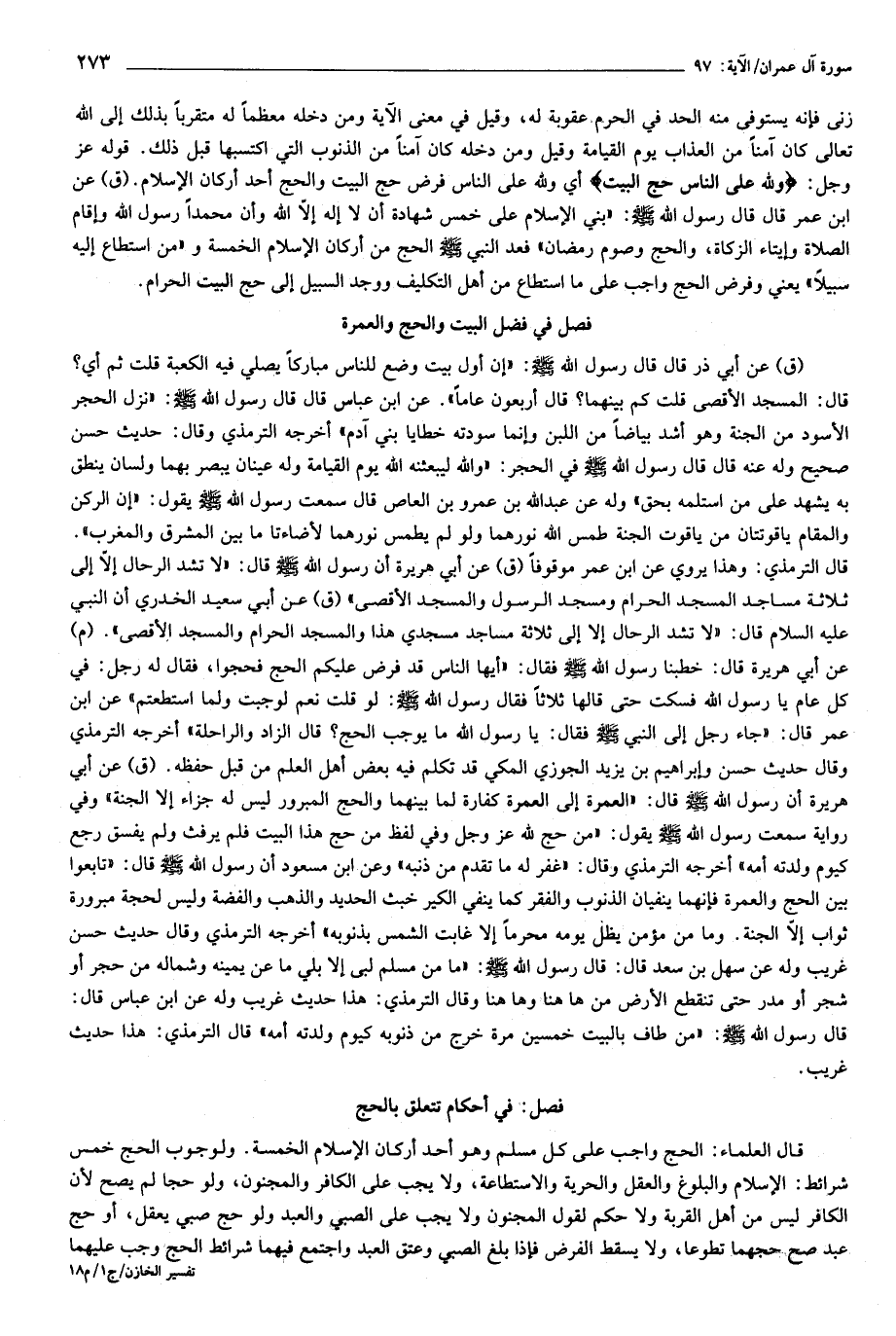قال الترمذي: وهذا يروي عن ابن عمر موقوفا (ق) عن أبي هريرة أن رسول الله صلّى الله عليه وسلّم قال: «لا تشد الرحال إلّا إلى ثلاثة مساجد المسجد الحرام ومسجد الرسول والمسجد الأقصى» (ق) عن أبي سعيد الخدري أن النبي عليه السلام قال: «لا تشد الرحال إلا إلى ثلاثة مساجد مسجدي هذا والمسجد الحرام والمسجد الأقصى». (م) عن أبي هريرة قال: خطبنا رسول الله صلّى الله عليه وسلّم فقال: «أيها الناس قد فرض عليكم الحج فحجوا، فقال له رجل: في كل عام يا رسول الله فسكت حتى قالها ثلاثا فقال رسول الله صلّى الله عليه وسلّم: لو قلت نعم لوجبت ولما استطعتم» عن ابن عمر قال: «جاء رجل إلى النبي صلّى الله عليه وسلّم فقال: يا رسول الله ما يوجب الحج؟ قال الزاد والراحلة» أخرجه الترمذي وقال حديث حسن وإبراهيم بن يزيد الجوزي المكي قد تكلم فيه بعض أهل العلم من قبل حفظه. (ق) عن أبي هريرة أن رسول الله صلّى الله عليه وسلّم قال: «العمرة إلى العمرة كفارة لما بينهما والحج المبرور ليس له جزاء إلا الجنة» وفي رواية سمعت رسول الله صلّى الله عليه وسلّم يقول: «من حج لله عز وجل وفي لفظ من حج هذا البيت فلم يرفث ولم يفسق رجع كيوم ولدته أمه» أخرجه الترمذي وقال: «غفر له ما تقدم من ذنبه» وعن ابن مسعود أن رسول الله صلّى الله عليه وسلّم قال: «تابعوا بين الحج والعمرة فإنهما ينفيان الذنوب والفقر كما ينفي الكير خبث الحديد والذهب والفضة وليس لحجة مبرورة ثواب إلّا الجنة. وما من مؤمن يظل يومه محرما إلا غابت الشمس بذنوبه» أخرجه الترمذي وقال حديث حسن غريب وله عن سهل بن سعد قال: قال رسول الله صلّى الله عليه وسلّم: «ما من مسلم لبى إلا بلي ما عن يمينه وشماله من حجر أو شجر أو مدر حتى تنقطع الأرض من هاهنا وهاهنا وقال الترمذي: هذا حديث غريب وله عن ابن عباس قال: