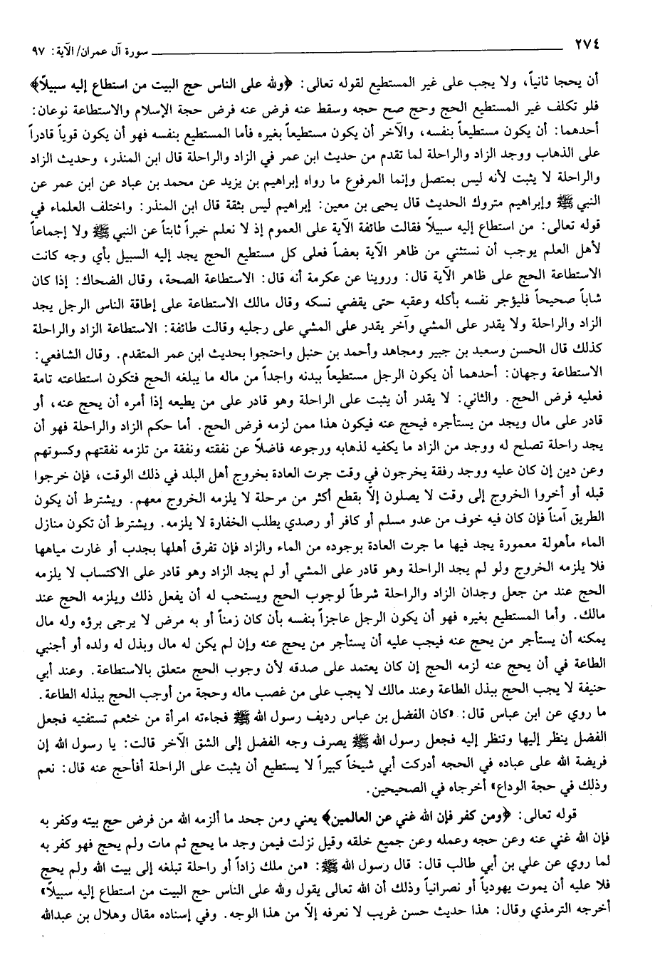 قوله تعالى: وَمَنْ كَفَرَ فَإِنَّ اللَّهَ غَنِيٌّ عَنِ الْعالَمِينَ يعني ومن جحد ما ألزمه الله من فرض حج بيته وكفر به فإن الله غني عنه وعن حجه وعمله وعن جميع خلقه وقيل نزلت فيمن وجد ما يحج ثم مات ولم يحج فهو كفر به لما روي عن علي بن أبي طالب قال: قال رسول الله صلّى الله عليه وسلّم: «من ملك زادا أو راحلة تبلغه إلى بيت الله ولم يحج فلا عليه أن يموت يهوديا أو نصرانيا وذلك أن الله تعالى يقول ولله على الناس حج البيت من استطاع إليه سبيلا» أخرجه الترمذي وقال: هذا حديث حسن غريب لا نعرفه إلّا من هذا الوجه. وفي إسناده مقال وهلال بن عبد الله