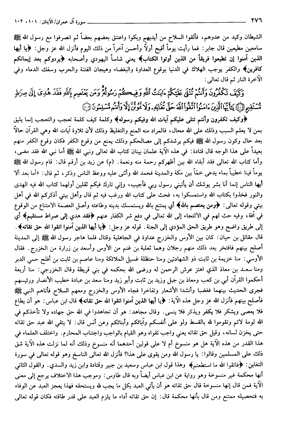 وَكَيْفَ تَكْفُرُونَ وَأَنْتُمْ تُتْلى عَلَيْكُمْ آياتُ اللَّهِ وَفِيكُمْ رَسُولُهُ وَمَنْ يَعْتَصِمْ بِاللَّهِ فَقَدْ هُدِيَ إِلى صِراطٍ مُسْتَقِيمٍ (101) يا أَيُّهَا الَّذِينَ آمَنُوا اتَّقُوا اللَّهَ حَقَّ تُقاتِهِ وَلا تَمُوتُنَّ إِلاَّ وَأَنْتُمْ مُسْلِمُونَ (102)