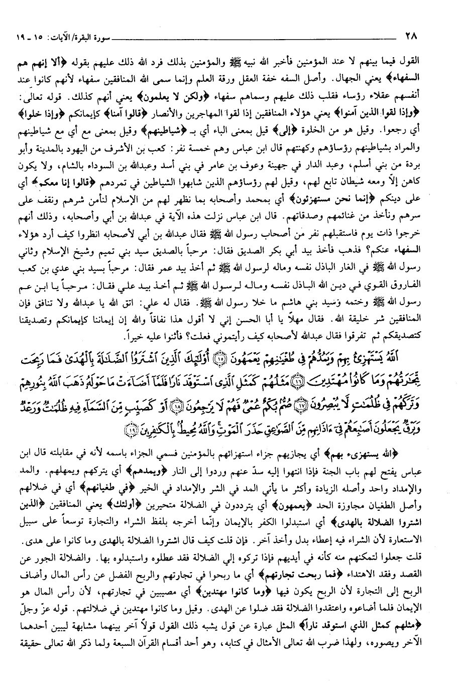اللَّهُ يَسْتَهْزِئُ بِهِمْ وَيَمُدُّهُمْ فِي طُغْيانِهِمْ يَعْمَهُونَ (15) أُولئِكَ الَّذِينَ اشْتَرَوُا الضَّلالَةَ بِالْهُدى فَما رَبِحَتْ تِجارَتُهُمْ وَما كانُوا مُهْتَدِينَ (16) مَثَلُهُمْ كَمَثَلِ الَّذِي اسْتَوْقَدَ ناراً فَلَمَّا أَضاءَتْ ما حَوْلَهُ ذَهَبَ اللَّهُ بِنُورِهِمْ وَتَرَكَهُمْ فِي ظُلُماتٍ لا يُبْصِرُونَ (17) صُمٌّ بُكْمٌ عُمْيٌ فَهُمْ لا يَرْجِعُونَ (18) أَوْ كَصَيِّبٍ مِنَ السَّماءِ فِيهِ ظُلُماتٌ وَرَعْدٌ وَبَرْقٌ يَجْعَلُونَ أَصابِعَهُمْ فِي آذانِهِمْ مِنَ الصَّواعِقِ حَذَرَ الْمَوْتِ وَاللَّهُ مُحِيطٌ بِالْكافِرِينَ (19)