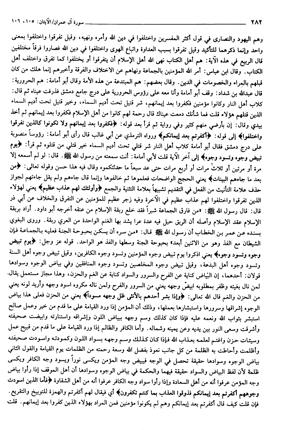 كلاب أهل النار وكانوا مؤمنين فكفروا بعد إيمانهم، شر قتيل تحت أديم السماء، وخير قتيل تحت أديم السماء الذين قتلهم هؤلاء قلت فما شأنك دمعت عيناك قال رحمة لهم كانوا من أهل الإسلام فكفروا بعد إيمانهم ثم أخذ بيدي وقال: إن بأرضي منهم كثير وفي رواية ثم قرأ بعد قوله: كَفَرُوا بَعْدَ إِيمانِهِمْ وَلا تَكُونُوا كَالَّذِينَ تَفَرَّقُوا وَاخْتَلَفُوا إلى قوله: أَكَفَرْتُمْ بَعْدَ إِيمانِكُمْ ورواه الترمذي عن أبي غالب قال رأى أبو أمامة: رؤوسا منصوبة على درج دمشق فقال أبو أمامة كلاب أهل النار شر قتلي تحت أديم السماء خير قتلي من قتلوه ثم قرأ: يَوْمَ تَبْيَضُّ وُجُوهٌ وَتَسْوَدُّ وُجُوهٌ إلى آخر الآية قلت لأبي أمامة: أنت سمعته من رسول الله صلّى الله عليه وسلّم. قال: لو لم أسمعه إلا مرة أو مرتين أو ثلاث مرات أو أربع مرات حتى عد سبعا ما حدثتكموه وقال فيه هذا حسن وقوله تعالى: مِنْ بَعْدِ ما جاءَهُمُ الْبَيِّناتُ يعني الحجج الواضحات فعلموها ثم خالفوها وإنما قال جاءهم ولم يقل جاءتهم لجواز حذف علامة التأنيث من الفعل في التقديم تشبيها بعلامة التثنية والجمع وَأُولئِكَ لَهُمْ عَذابٌ عَظِيمٌ يعني لهؤلاء الذين تفرقوا واختلفوا لهم عذاب عظيم في الآخرة وفيه زجر عظيم للمؤمنين عن التفرق والخلاف عن أبي ذر قال: قال رسول الله صلّى الله عليه وسلّم: «من فارق الجماعة شبرا فقد خلع ربقة الإسلام من عنقه أخرجه أبو داود. أراد بربقة الإسلام عقد الإسلام وأصله أن الربق حبل فيه عدة عرا يشد بها الغنم الواحدة من العري ربقة. وروى البغوي بسنده عن عمر بن الخطاب أن رسول الله صلّى الله عليه وسلّم قال: «من سره أن يسكن بحبوحة الجنة فعليه بالجماعة فإن الشيطان مع الفذ وهو من الاثنين أبعد» بحبوحة الجنة وسطها والفذ هو الواحد. قوله عز وجل: يَوْمَ تَبْيَضُّ وُجُوهٌ وَتَسْوَدُّ وُجُوهٌ يعني اذكروا يوم تبيض وجوه المؤمنين وتسود وجوه الكافرين، وقيل تبيض وجوه أهل السنة وتسود وجوه أهل البدعة، وقيل تبيض وجوه المخلصين وتسود وجوه المنافقين وفي بياض الوجوه وسوادها قولان: أحدهما، إن البياض كناية عن الفرح والسرور والسواد كناية عن الغم والحزن، وهذا مجاز مستعمل يقال لمن نال بغيته وظفر بمطلوبه ابيضّ وجهه يعني من السرور والفرح ولمن ناله مكروه اسود وجهه وأريد لونه يعني من الحزن والغم قال الله تعالى: وَإِذا بُشِّرَ أَحَدُهُمْ بِالْأُنْثى ظَلَّ وَجْهُهُ مُسْوَدًّا يعني من الحزن فعلى هذا بياض الوجوه إشراقها وسرورها واستبشارها بعملها، وذلك أن المؤمن إذا ورد القيامة على ما قدم من خير وعمل صالح استبشر بثواب الله ونعمه عليه فإذا كان كذلك وسم وجهه ببياض اللون وإشراقه واستنارته وابيضت صحيفته وأشرقت وسعى النور بين يديه وعن يمينه وشماله. وأما الكافر والظالم إذا ورد القيامة على ما قدم من قبيح عمل وسيئات حزن واغتم لعلمه بعذاب الله فإذا كان كذلك وسم وجهه بسواد اللون وكمودته واسودت صحيفته وأظلمت وأحاطت به الظلمة من كل جانب نعوذ بفضل الله وسعة رحمته من الظلمات يوم القيامة والقول الثاني بياض الوجوه وسوادها حقيقة تحصل في الوجه فيبيض وجه المؤمن ويكسى نورا ويسود وجه الكافر ويكسى ظلمة لأن لفظ البياض والسواد حقيقة فيهما والحكمة في بياض الوجوه وسوادها أن أهل الموقف إذا رأوا بياض وجه المؤمن عرفوا أنه من أهل السعادة وإذا رأوا سواد وجه الكافر عرفوا أنه من أهل الشقاوة فَأَمَّا الَّذِينَ اسْوَدَّتْ وُجُوهُهُمْ أَكَفَرْتُمْ بَعْدَ إِيمانِكُمْ فَذُوقُوا الْعَذابَ بِما كُنْتُمْ تَكْفُرُونَ أي فيقال لهم أكفرتم والهمزة للتوبيخ والتقريع.