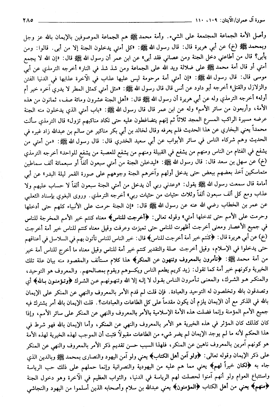 في الدنيا الفتن والزلازل والقتل» أخرجه أبو داود عن أنس قال قال رسول الله صلّى الله عليه وسلّم: «مثل أمتي كمثل المطر لا يدري آخره خير أم أوله» أخرجه الترمذي وله عن أبي هريرة أن رسول الله صلّى الله عليه وسلّم قال: «أهل الجنة عشرون ومائة صف، ثمانون من هذه الأمة، وأربعون من سائر الأمم» وله عن ابن عمر قال قال رسول الله صلّى الله عليه وسلّم: «باب أمتي الذي يدخلون منه الجنة عرضه مسيرة الراكب المسرع المجد ثلاثا ثم إنهم يتضاغطون عليه حتى تكاد مناكبهم تزول» قال الترمذي سألت محمدا يعني البخاري عن هذا الحديث فلم يعرفه وقال لخالد بن أبي بكر مناكير عن سالم بن عبد الله زاد غيره في الحديث وهم شركاء الناس في سائر الأبواب عن أبي سعيد الخدري قال: قال رسول الله صلّى الله عليه وسلّم: «من أمتي من يشفع في الفئام من الناس ومنهم من يشفع في القبيلة ومنهم من يشفع للعصبة من يشفع للواحد» أخرجه الترمذي (خ) عن سهل بن سعد قال: قال رسول الله صلّى الله عليه وسلّم: «ليدخلن الجنة من أمتي سبعون ألفا أو سبعمائة ألف سماطين متماسكين آخذ بعضهم ببعض حتى يدخل أولهم وآخرهم الجنة وجوههم على صورة القمر ليلة البدر» عن أبي أمامة قال سمعت رسول الله صلّى الله عليه وسلّم يقول: «وعدني ربي أن يدخل من أمتي الجنة سبعون ألفا لا حساب عليهم ولا عذاب ومع كل ألف سبعون ألفا وثلاث حثيات من حثيات ربي» أخرجه الترمذي. وروى البغوي بإسناد الثعلبي عن عمر بن الخطاب رضي الله عنه عن رسول الله صلّى الله عليه وسلّم قال: «إن الجنة حرمت على الأنبياء كلهم حتى أدخلها وحرمت على الأمم حتى تدخلها أمتي» وقوله تعالى: أُخْرِجَتْ لِلنَّاسِ معناه كنتم خير الأمم المخرجة للناس في جميع الأعصار ومعنى أخرجت أظهرت للناس حتى تميزت وعرفت وقيل معناه كنتم للناس خير أمة أخرجت (خ) عن أبي هريرة قال: كُنْتُمْ خَيْرَ أُمَّةٍ أُخْرِجَتْ لِلنَّاسِ قال: خير الناس للناس تأتون بهم في السلاسل في أعناقهم حتى يدخلوا في الإسلام، وقيل أخرجت صلة والتقدير كنتم خير أمة للناس وقيل معناه ما أخرج للناس أمة خير من أمة محمد صلّى الله عليه وسلّم: تَأْمُرُونَ بِالْمَعْرُوفِ وَتَنْهَوْنَ عَنِ الْمُنْكَرِ هذا كلام مستأنف والمقصود منه بيان علة تلك الخيرية وكونهم خير أمة كما تقول: زيد كريم يطعم الناس ويكسوهم ويقوم بمصالحهم. والمعروف هو التوحيد، والمنكر هو الشرك، والمعنى تأمرون الناس بقول لا إله إلا الله وتنهونهم عن الشرك وَتُؤْمِنُونَ بِاللَّهِ أي وتصدقون بالله وتخلصون له التوحيد والعبادة. فإن قلت لم قدم الأمر بالمعروف والنهي عن المنكر على الإيمان بالله في الذكر مع أن الإيمان يلزم أن يكون مقدما على كل الطاعات والعبادات؟. قلت الإيمان بالله أمر يشترك فيه جميع الأمم المؤمنة وإنما فضلت هذه الأمة الإسلامية بالأمر بالمعروف والنهي عن المنكر على سائر الأمم، وإذا كان كذلك كان المؤثر في هذه الخيرية هو الأمر بالمعروف والنهي عن المنكر، وأما الإيمان بالله فهو شرط في هذا الحكم لأنه ما لم يوجد الإيمان لم يضر شيء من الطاعات مقبولا فثبت أن الموجب لهذه الخيرية لهذه الأمة هو كونهم آمرين بالمعروف ناهين عن المنكر، فلهذا السبب حسن تقديم ذكر الأمر بالمعروف والنهي عن المنكر على ذكر الإيمان وقوله تعالى: وَلَوْ آمَنَ أَهْلُ الْكِتابِ يعني ولو آمن اليهود والنصارى بمحمد صلّى الله عليه وسلّم وبالدين الذي جاء به لَكانَ خَيْراً لَهُمْ يعني مما هم عليه من اليهودية والنصرانية وإنما حملهم على ذلك حب الرياسة واستتباع العوام ولو أنهم آمنوا لحصلت لهم الرياسة في الدنيا، والثواب العظيم في الآخرة وهو دخول الجنة مِنْهُمُ يعني من أهل الكتاب الْمُؤْمِنُونَ يعني عبد الله بن سلام وأصحابه الذين أسلموا من اليهود والنجاشي