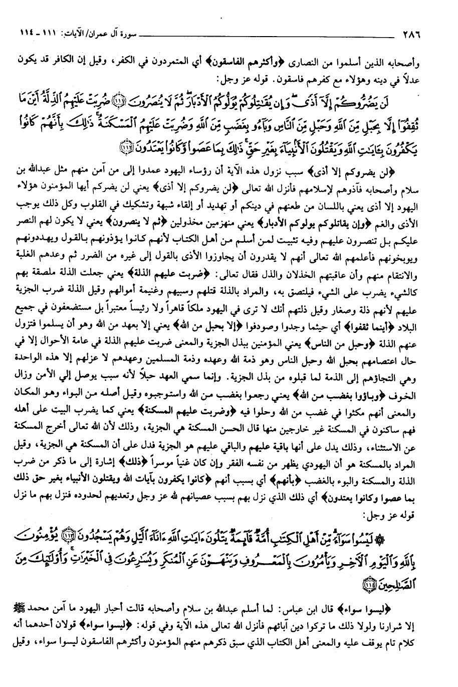 لَنْ يَضُرُّوكُمْ إِلَّا أَذىً سبب نزول هذه الآية أن رؤساء اليهود عمدوا إلى من آمن منهم مثل عبد الله بن سلام وأصحابه فآذوهم لإسلامهم فأنزل الله تعالى لَنْ يَضُرُّوكُمْ إِلَّا أَذىً يعني لن يضركم أيها المؤمنون هؤلاء اليهود إلا أذى يعني باللسان من طعنهم في دينكم أو تهديد أو إلقاء شبهة وتشكيك في القلوب وكل ذلك يوجب الأذى والغم وَإِنْ يُقاتِلُوكُمْ يُوَلُّوكُمُ الْأَدْبارَ يعني منهزمين مخذولين ثُمَّ لا يُنْصَرُونَ يعني لا يكون لهم النصر عليكم بل تنصرون عليهم وفيه تثبيت لمن أسلم من أهل الكتاب لأنهم كانوا يؤذونهم بالقول ويهددونهم ويوبخونهم فأعلمهم الله تعالى أنهم لا يقدرون أن يجاوزوا الأذى بالقول إلى غيره من الضرر ثم وعدهم الغلبة والانتقام منهم وأن عاقبتهم الخذلان والذل فقال تعالى: ضُرِبَتْ عَلَيْهِمُ الذِّلَّةُ يعني جعلت الذلة ملصقة بهم كالشيء يضرب على الشيء فيلتصق به، والمراد بالذلة قتلهم وسبيهم وغنيمة أموالهم وقيل الذلة ضرب الجزية عليهم لأنهم ذلة وصغار وقيل ذلتهم أنك لا ترى في اليهود ملكا قاهرا ولا رئيسا معتبرا بل مستضعفون في جميع البلاد أَيْنَما ثُقِفُوا أي حيثما وجدوا وصودفوا إِلَّا بِحَبْلٍ مِنَ اللَّهِ يعني إلا بعهد من الله وهو أن يسلموا فتزول عنهم الذلة وَحَبْلٍ مِنَ النَّاسِ يعني المؤمنين ببذل الجزية والمعنى ضربت عليهم الذلة في عامة الأحوال إلا في حال اعتصامهم بحبل الله وحبل الناس وهو ذمة الله وعهده وذمة المسلمين وعهدهم لا عزلهم إلا هذه الواحدة وهي التجائوهم إلى الذمة لما قبلوه من بذل الجزية. وإنما سمي العهد حبلا لأنه سبب يوصل إلي الأمن وزال الخوف وَباؤُ بِغَضَبٍ مِنَ اللَّهِ يعني رجعوا بغضب من الله واستوجبوه وقيل أصله من البواء وهو المكان والمعنى أنهم مكثوا في غضب من الله وحلوا فيه وَضُرِبَتْ عَلَيْهِمُ الْمَسْكَنَةُ يعني كما يضرب البيت على أهله فهم ساكنون في المسكنة غير خارجين منها قال الحسن المسكنة هي الجزية، وذلك لأن الله تعالى أخرج المسكنة عن الاستثناء، وذلك يدل على أنها باقية عليهم والباقي عليهم هو الجزية فدل على أن المسكنة هي الجزية، وقيل المراد بالمسكنة هو أن اليهودي يظهر من نفسه الفقر وإن كان غنيا موسرا ذلِكَ إشارة إلى ما ذكر من ضرب الذلة والمسكنة والبوء بالغضب بِأَنَّهُمْ أي بسبب أنهم كانُوا يَكْفُرُونَ بِآياتِ اللَّهِ وَيَقْتُلُونَ الْأَنْبِياءَ بِغَيْرِ حَقٍّ ذلِكَ بِما عَصَوْا وَكانُوا يَعْتَدُونَ أي ذلك الذي نزل بهم بسبب عصيانهم لله عز وجل وتعديهم لحدوده فنزل بهم ما نزل قوله عز وجل: