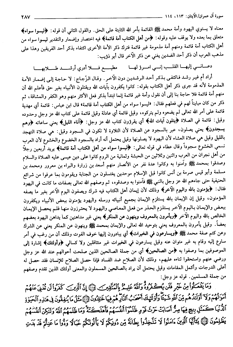 أراد أم غير رشد فاكتفى بذكر أحد الرشدين دون الآخر. وقال الزّجاج: لا حاجة إلى إضمار الأمة المذمومة لأنه قد جرى ذكر أهل الكتاب بقوله: كانوا يكفرون بآيات الله ويقتلون الأنبياء بغير حق فأعلم الله أن منهم أمة قائمة فلا حاجة بنا إلى أن نقول وأمة غير قائمة إنما ابتدأ بذكر فعل الأكثر منهم وهو الكفر والمشاقة، ثم ذكر من كان مباينا لهم في فعلهم فقال: «ليسوا سواء من أهل الكتاب أمة قائمة» قال ابن عباس: قائمة أي مهدية قائمة على أمر الله تعالى لم يضعوه ولم يتركوه، وقيل قائمة أي عادلة وقيل قائمة على كتاب الله عز وجل وحدوده وقيل: قائمة في الصلاة يَتْلُونَ آياتِ اللَّهِ أي يقرءون كتاب الله عز وجل: آناءَ اللَّيْلِ يعني ساعاته وَهُمْ يَسْجُدُونَ يعني يصلون، عبر بالسجود عن الصلاة لأن التلاوة لا تكون في السجود وقيل: هي صلاة التهجد بالليل وقيل هي صلاة العشاء لأن اليهود لا يصلونها وقيل يحتمل أنه أراد بالسجود الخضوع والخشوع لأن العرب تسمي الخشوع سجودا وقال عطاء في قوله تعالى: لَيْسُوا سَواءً مِنْ أَهْلِ الْكِتابِ أُمَّةٌ قائِمَةٌ يريد أربعين رجلا من أهل نجران من العرب واثنين وثلاثين من الحبشة وثمانية من الروم كانوا على دين عيسى عليه الصلاة والسلام وصدقوا بمحمد صلّى الله عليه وسلّم وآمنوا به وكانوا عدة نفر من الأنصار منهم أسعد بن زرارة والبراء بن معرور ومحمد بن مسلمة وأبو قيس صرمة بن أنس كانوا قبل الإسلام موحدين يغتسلون من الجنابة ويقومون بما عرفوا من شرائع الحنيفية حتى جاءهم الله عز وجل بالنبي صلّى الله عليه وسلّم فآمنوا به وصدقوه، ثم وصفهم الله تعالى بصفات ما كانت في اليهود فقال: يُؤْمِنُونَ بِاللَّهِ وَالْيَوْمِ الْآخِرِ وذلك لأن إيمان أهل الكتاب فيه شرك ويصفون اليوم الآخر بغير ما يصفه المؤمنون، وقيل إن الإيمان بالله يستلزم الإيمان بجميع أنبيائه ورسله واليهود يؤمنون ببعض الأنبياء ويكفرون ببعض والإيمان باليوم الآخر يستلزم الحذر من فعل المعاصي واليهود لا يحترزون منها فلم يحصل الإيمان الخالص بالله واليوم الآخر وَيَأْمُرُونَ بِالْمَعْرُوفِ وَيَنْهَوْنَ عَنِ الْمُنْكَرِ يعني غير مداهنين كما يداهن اليهود بعضهم بعضا. وقيل يأمرون بالمعروف يعني بتوحيد الله تعالى والإيمان بمحمد صلّى الله عليه وسلّم وينهون عن المنكر يعني عن الشرك وعن كتم صفة محمد صلّى الله عليه وسلّم وَيُسارِعُونَ فِي الْخَيْراتِ أي يبادرون إليها خوف الفوت وذلك أن من رغب في أمر سارع إليه وقام به غير متوان عنه وقيل يسارعون في الخيرات غير متثاقلين ولا كسالى وَأُولئِكَ إشارة إلى الموصوفين بما وصفوا به مِنَ الصَّالِحِينَ أي من جملة الصالحين الذين صلحت أحوالهم عند الله عز وجل ورضي عنهم واستحقوا ثناءه عليهم، وذلك لأن الصلاح ضد الفساد فإذا حصل الصلاح للإنسان فقد حصل له أعلى الدرجات وأكمل المقامات وقيل يحتمل أن يراد بالصالحين المسلمون والمعنى أولئك الذين تقدم وصفهم من جملة المسلمين. قوله عز وجل: