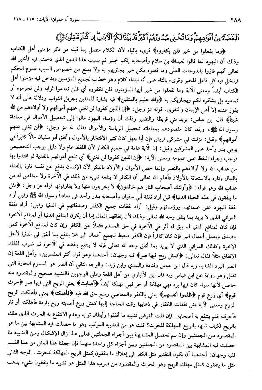 وَما يَفْعَلُوا مِنْ خَيْرٍ فَلَنْ يُكْفَرُوهُ قرئ بالياء لأن الكلام متصل بما قبله من ذكر مؤمني أهل الكتاب وذلك أن اليهود لما قالوا لعبد الله بن سلام وأصحابه إنكم خسر ثم بسبب هذا الدين الذي دخلتم فيه فأخبر الله تعالى أنهم فازوا بالدرجات العلى وما فعلوه مكن خير يجازيهم به ولا يمنع من خصوص السبب عموم الحكم فيدخل فيه كل فاعل للخير وقرئ بالتاء على أنه ابتداء كلام وهو خطاب لجميع المؤمنين ويدخل فيه مؤمنوا أهل الكتاب أيضا ومعنى الآية وما تفعلوا من خير أيها المؤمنون فلن تكفروه أي فلن تعدموا ثوابه ولن تجرموه أو تمنعوه بل يشكره لكم ويجازيكم به وَاللَّهُ عَلِيمٌ بِالْمُتَّقِينَ فيه بشارة للمتقين بجزيل الثواب ودلالة على أنه لا يفوز عنده إلا أهل الإيمان والتقوى. قوله عز وجل: إِنَّ الَّذِينَ كَفَرُوا لَنْ تُغْنِيَ عَنْهُمْ أَمْوالُهُمْ وَلا أَوْلادُهُمْ مِنَ اللَّهِ شَيْئاً قال ابن عباس: يريد بني قريظة والنضير وذلك أن رؤساء اليهود مالوا إلى تحصيل الأموال في معاداة رسول الله صلّى الله عليه وسلّم، وإنما كان مقصودهم بمعاداته تحصيل الرياسة والأموال فقال الله عز وجل: لَنْ تُغْنِيَ عَنْهُمْ أَمْوالُهُمْ وقيل: نزلت في مشركي قريش فإن أبا جهل كان كثير الافتخار بالأموال وأنفق أبو سفيان مالا كثيرا في يومي بدر وأحد على المشركين وقيل: إن الآية عامة في جميع الكفار لأن اللفظ عام ولا دليل يوجب التخصيص فوجب إجراء اللفظ على عمومه ومعنى الآية: إِنَّ الَّذِينَ كَفَرُوا لَنْ تُغْنِيَ أي تدفع أموالهم بالفدية لو افتدوا بها من عذاب الله ولا أولادهم بالنصر وإنما خص الأموال والأولاد بالذكر لأن الإنسان يدفع عن نفسه تارة بالفداء بالمال وتارة بالاستعانة بالأولاد فأعلم الله تعالى أن الكافر لا ينفعه شيء من ذلك في الآخرة ولا مخلص له من عذاب الله وهو قوله: وَأُولئِكَ أَصْحابُ النَّارِ هُمْ فِيها خالِدُونَ لا يخرجون منها ولا يفارقونها قوله عز وجل: ثَلُ ما يُنْفِقُونَ فِي هذِهِ الْحَياةِ الدُّنْيا