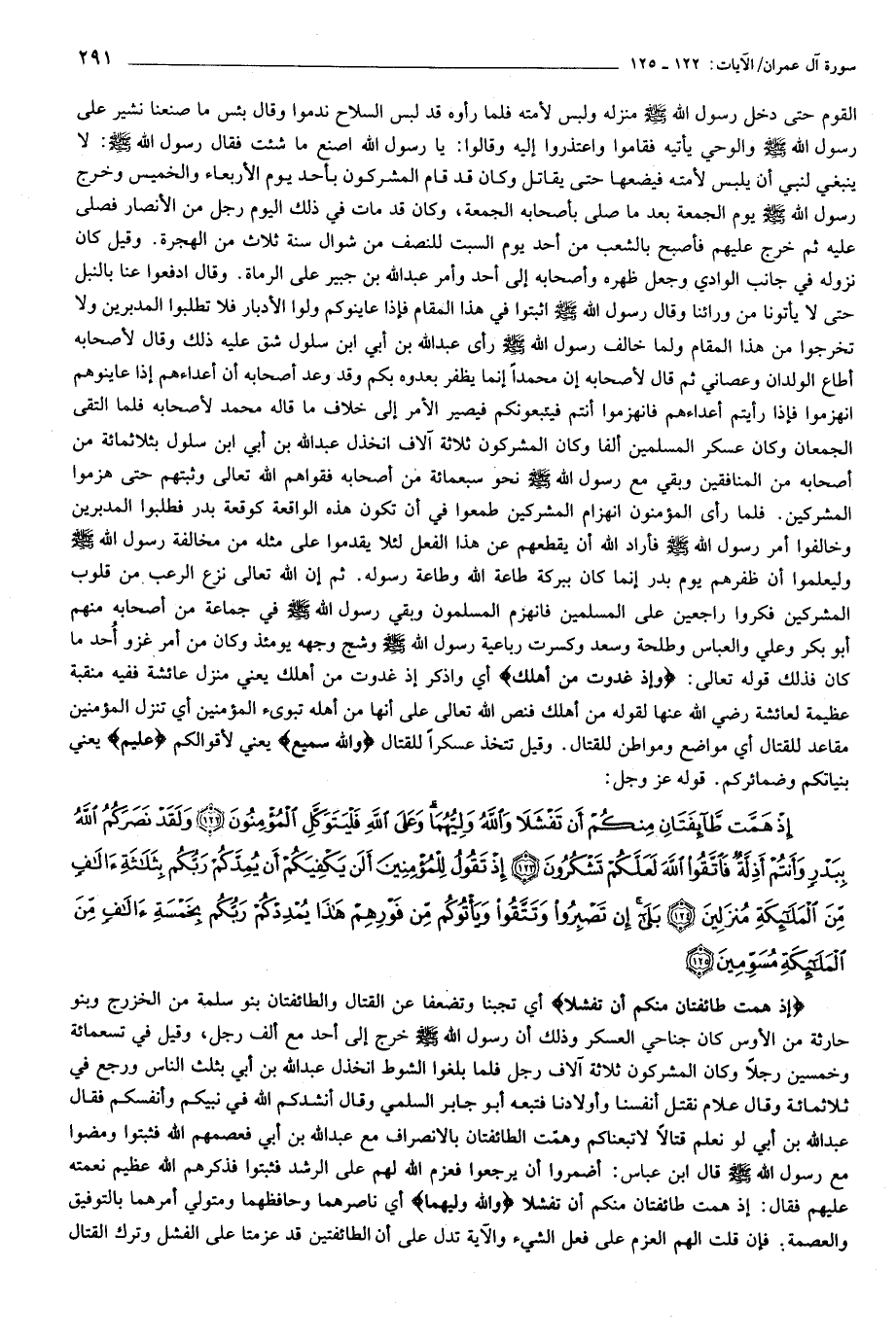 إِذْ هَمَّتْ طائِفَتانِ مِنْكُمْ أَنْ تَفْشَلا وَاللَّهُ وَلِيُّهُما وَعَلَى اللَّهِ فَلْيَتَوَكَّلِ الْمُؤْمِنُونَ (122) وَلَقَدْ نَصَرَكُمُ اللَّهُ بِبَدْرٍ وَأَنْتُمْ أَذِلَّةٌ فَاتَّقُوا اللَّهَ لَعَلَّكُمْ تَشْكُرُونَ (123) إِذْ تَقُولُ لِلْمُؤْمِنِينَ أَلَنْ يَكْفِيَكُمْ أَنْ يُمِدَّكُمْ رَبُّكُمْ بِثَلاثَةِ آلافٍ مِنَ الْمَلائِكَةِ مُنْزَلِينَ (124) بَلى إِنْ تَصْبِرُوا وَتَتَّقُوا وَيَأْتُوكُمْ مِنْ فَوْرِهِمْ هذا يُمْدِدْكُمْ رَبُّكُمْ بِخَمْسَةِ آلافٍ مِنَ الْمَلائِكَةِ مُسَوِّمِينَ (125)