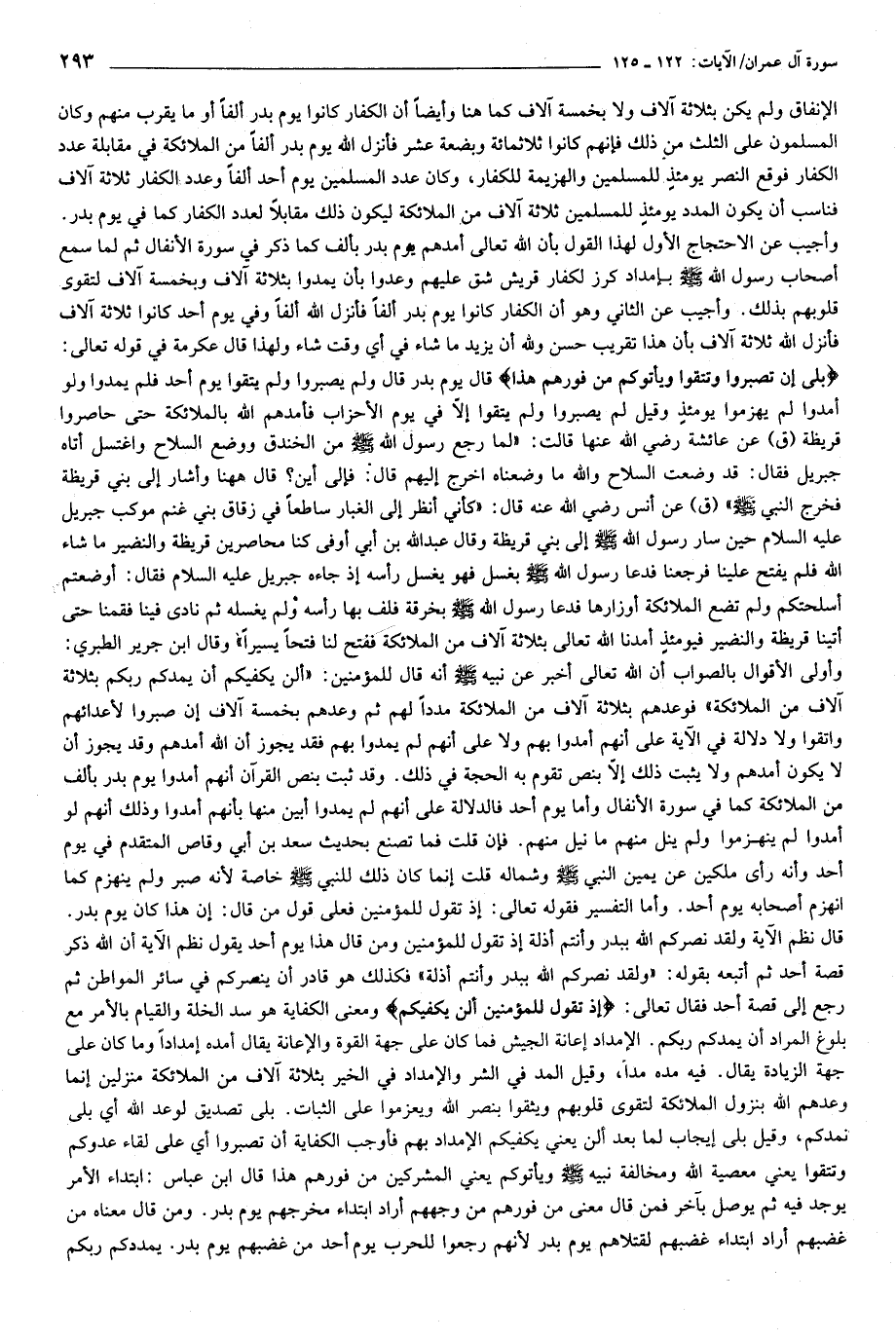 وأولى الأقوال بالصواب أن الله تعالى أخبر عن نبيه صلّى الله عليه وسلّم أنه قال للمؤمنين: «ألن يكفيكم أن يمدكم ربكم بثلاثة آلاف من الملائكة» فوعدهم بثلاثة آلاف من الملائكة مددا لهم ثم وعدهم بخمسة آلاف إن صبروا لأعدائهم واتقوا ولا دلالة في الآية على أنهم أمدوا بهم ولا على أنهم لم يمدوا بهم فقد يجوز أن الله أمدهم وقد يجوز أن لا يكون أمدهم ولا يثبت ذلك إلّا بنص تقوم به الحجة في ذلك. وقد ثبت بنص القرآن أنهم أمدوا يوم بدر بألف من الملائكة كما في سورة الأنفال وأما يوم أحد فالدلالة على أنهم لم يمدوا أبين منها بأنهم أمدوا وذلك أنهم لو أمدوا لم ينهزموا ولم ينل منهم ما نيل منهم. فإن قلت فما تصنع بحديث سعد بن أبي وقاص المتقدم في يوم أحد وأنه رأى ملكين عن يمين النبي صلّى الله عليه وسلّم وشماله قلت إنما كان ذلك للنبي صلّى الله عليه وسلّم خاصة لأنه صبر ولم ينهزم كما انهزم أصحابه يوم أحد. وأما التفسير فقوله تعالى: إذ تقول للمؤمنين فعلى قول من قال: إن هذا كان يوم بدر.