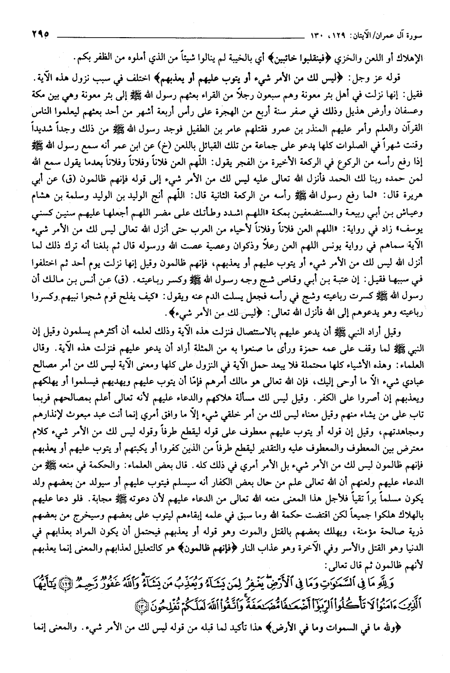 فقيل: إنها نزلت في أهل بئر معونة وهم سبعون رجلا من القراء بعثهم رسول الله صلّى الله عليه وسلّم إلى بئر معونة وهي بين مكة وعسفان وأرض هذيل وذلك في صفر سنة أربع من الهجرة على رأس أربعة أشهر من أحد بعثهم ليعلموا الناس القرآن والعلم وأمر عليهم المنذر بن عمرو فقتلهم عامر بن الطفيل فوجد رسول الله صلّى الله عليه وسلّم من ذلك وجدا شديدا وقنت شهرا في الصلوات كلها يدعو على جماعة من تلك القبائل باللعن (خ) عن ابن عمر أنه سمع رسول الله صلّى الله عليه وسلّم إذا رفع رأسه من الركوع في الركعة الأخيرة من الفجر يقول: اللهم العن فلانا وفلانا وفلانا بعد ما يقول سمع الله لمن حمده ربنا لك الحمد فأنزل الله تعالى عليه ليس لك من الأمر شيء إلى قوله فإنهم ظالمون (ق) عن أبي هريرة قال: «لما رفع رسول الله صلّى الله عليه وسلّم رأسه من الركعة الثانية قال: اللهم أنج الوليد بن الوليد وسلمة بن هشام وعياش بن أبي ربيعة والمستضعفين بمكة «اللهم اشدد وطأتك على مضر اللهم أجعلها عليهم سنين كسني يوسف» زاد في رواية: «اللهم العن فلانا وفلانا لأحياء من العرب حتى أنزل الله تعالى ليس لك من الأمر شيء الآية سماهم في رواية يونس اللهم العن رعلا وذكوان وعصية عصت الله ورسوله قال ثم بلغنا أنه ترك ذلك لما أنزل الله ليس لك من الأمر شيء أو يتوب عليهم أو يعذبهم، فإنهم ظالمون وقيل إنها نزلت يوم أحد ثم اختلفوا في سببها فقيل: إن عتبة بن أبي وقاص شج وجه رسول الله صلّى الله عليه وسلّم وكسر رباعيته. (ق) عن أنس بن مالك أن رسول الله صلّى الله عليه وسلّم كسرت رباعيته وشج في رأسه فجعل يسلت الدم عنه ويقول: «كيف يفلح قوم شجوا نبيهم وكسروا رباعيته وهو يدعوهم إلى الله فأنزل الله تعالى: لَيْسَ لَكَ مِنَ الْأَمْرِ شَيْءٌ.