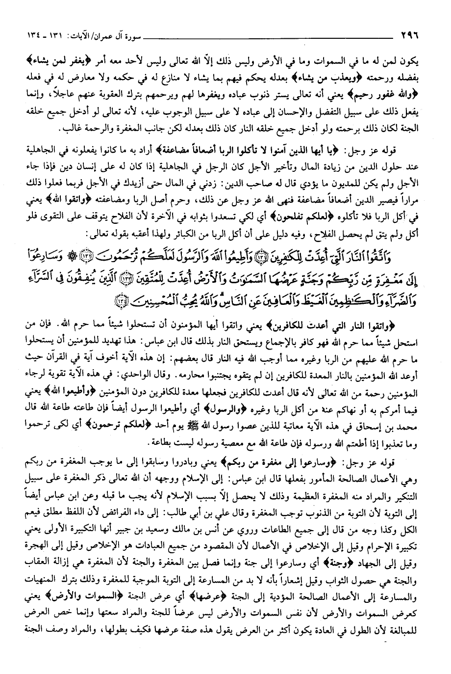 وَاتَّقُوا النَّارَ الَّتِي أُعِدَّتْ لِلْكافِرِينَ (131) وَأَطِيعُوا اللَّهَ وَالرَّسُولَ لَعَلَّكُمْ تُرْحَمُونَ (132) وَسارِعُوا إِلى مَغْفِرَةٍ مِنْ رَبِّكُمْ وَجَنَّةٍ عَرْضُهَا السَّماواتُ وَالْأَرْضُ أُعِدَّتْ لِلْمُتَّقِينَ (133) الَّذِينَ يُنْفِقُونَ فِي السَّرَّاءِ وَالضَّرَّاءِ وَالْكاظِمِينَ الْغَيْظَ وَالْعافِينَ عَنِ النَّاسِ وَاللَّهُ يُحِبُّ الْمُحْسِنِينَ (134)