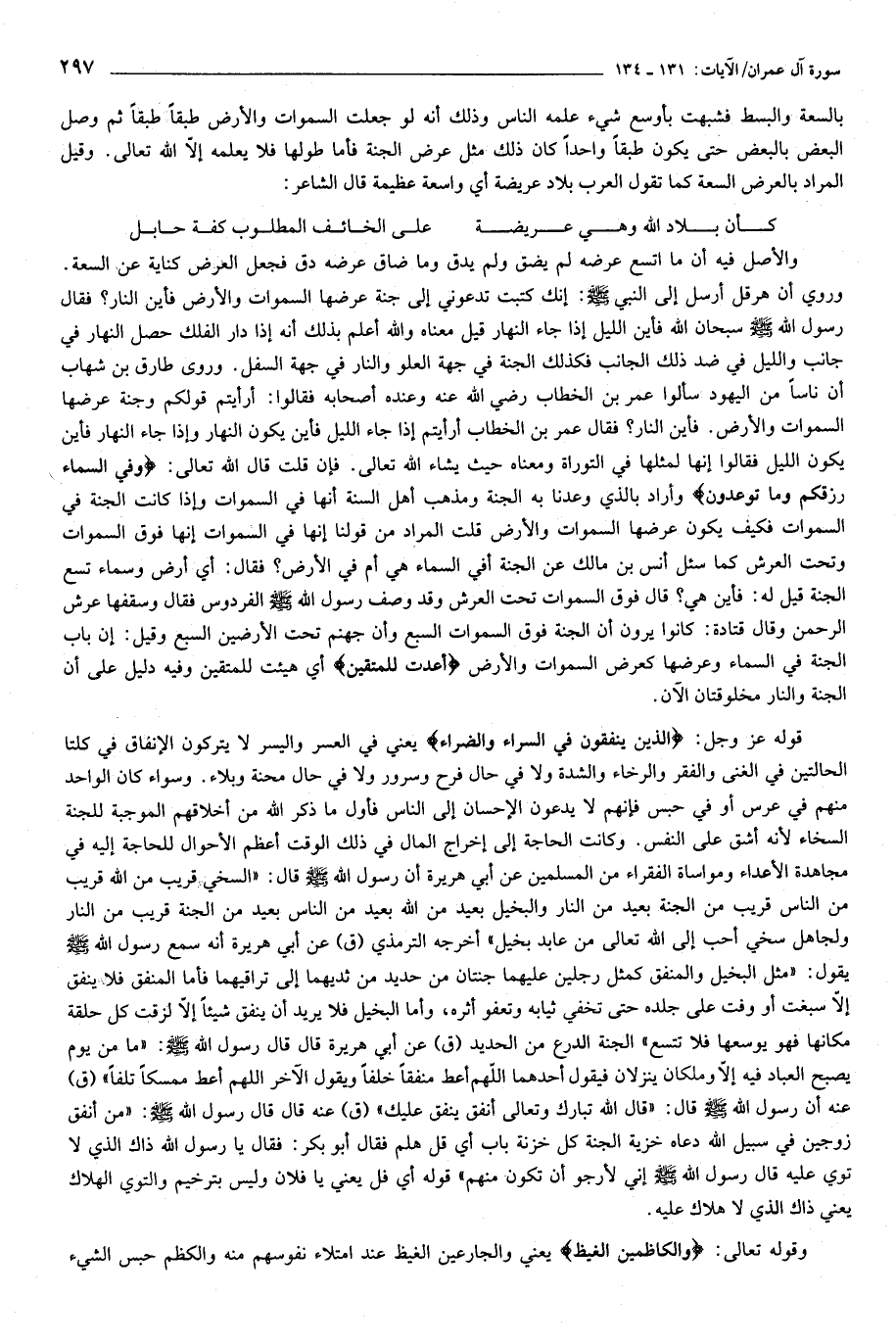 قوله عز وجل: الَّذِينَ يُنْفِقُونَ فِي السَّرَّاءِ وَالضَّرَّاءِ يعني في العسر واليسر لا يتركون الإنفاق في كلتا الحالتين في الغنى والفقر والرخاء والشدة ولا في حال فرح وسرور ولا في حال محنة وبلاء. وسواء كان الواحد منهم في عرس أو في حبس فإنهم لا يدعون الإحسان إلى الناس فأول ما ذكر الله من أخلاقهم الموجبة للجنة السخاء لأنه أشق على النفس. وكانت الحاجة إلى إخراج المال في ذلك الوقت أعظم الأحوال للحاجة إليه في مجاهدة الأعداء ومواساة الفقراء من المسلمين عن أبي هريرة أن رسول الله صلّى الله عليه وسلّم قال: «السخي قريب من الله قريب من الناس قريب من الجنة بعيد من النار والبخيل بعيد من الله بعيد من الناس بعيد من الجنة قريب من النار ولجاهل سخي أحب إلى الله تعالى من عابد بخيل» أخرجه الترمذي (ق) عن أبي هريرة أنه سمع رسول الله صلّى الله عليه وسلّم يقول: «مثل البخيل والمنفق كمثل رجلين عليهما جنتان من حديد من ثديهما إلى تراقيهما فأما المنفق فلا ينفق إلّا سبغت أو وفت على جلده حتى تخفي ثيابه وتعفو أثره، وأما البخيل فلا يريد أن ينفق شيئا إلّا لزقت كل حلقة مكانها فهو يوسعها فلا تتسع» الجنة الدرع من الحديد (ق) عن أبي هريرة قال قال رسول الله صلّى الله عليه وسلّم: «ما من يوم يصبح العباد فيه إلّا وملكان ينزلان فيقول أحدهما اللهم أعط منفقا خلفا ويقول الآخر اللهم أعط ممسكا تلفا» (ق) عنه أن رسول الله صلّى الله عليه وسلّم قال: «قال الله تبارك وتعالى أنفق ينفق عليك» (ق) عنه قال قال رسول الله صلّى الله عليه وسلّم: «من أنفق زوجين في سبيل الله دعاه خزية الجنة كل خزنة باب أي قل هلم فقال أبو بكر: فقال يا رسول الله ذاك الذي لا توي عليه قال رسول الله صلّى الله عليه وسلّم إني لأرجو أن تكون منهم» قوله أي فل يعني يا فلان وليس بترخيم والتوي الهلاك يعني ذاك الذي لا هلاك عليه.