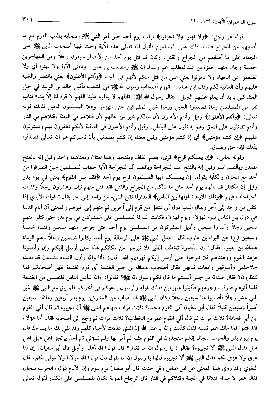 قوله عز وجل: وَلا تَهِنُوا وَلا تَحْزَنُوا نزلت يوم أحد حين أمر النبي صلّى الله عليه وسلّم أصحابه بطلب القوم مع ما أصابهم من الجراح فاشتد ذلك على المسلمين فأنزل الله تعالى هذه الآية وحث فيها أصحاب النبي صلّى الله عليه وسلّم على الجهاد على ما أصابهم من الجراح والقتل. وكان قد قتل يوم أحد من الأنصار سبعون رجلا ومن المهاجرين خمسة رجال منهم حمزة بن عبد المطلب عم رسول الله صلّى الله عليه وسلّم ومصعب بن عمير. ومعنى الآية ولا تهنوا أي ولا تضعفوا عن الجهاد ولا تحزنوا يعني على من قتل منكم لأنهم في الجنة وَأَنْتُمُ الْأَعْلَوْنَ يعني بالنصر والغلبة عليهم وأن العاقبة لكم وقال ابن عباس: انهزم أصحاب رسول الله صلّى الله عليه وسلّم في الشعب فأقبل خالد بن الوليد في خيل المشركين يريد أن يعلو عليهم الجبل. فقال رسول الله صلّى الله عليه وسلّم: «اللهم لا يعلوه علينا اللهم لا قوة لنا إلّا بك» فثاب نفر من المسلمين رماة فصعدوا الجبل ورموا خيل المشركين حتى انهزموا وعلا المسلمون الجبل فذلك قوله تعالى: وَأَنْتُمُ الْأَعْلَوْنَ وقيل وأنتم الأعلون لأن حالكم خير من حالهم لأن قتلاكم في الجنة وقتلاهم في النار وأنتم تقاتلون على الحق وهم يقاتلون على الباطل. وقيل وأنتم الأعلون في العاقبة لأنكم تظفرون بهم وتستولون عليهم إِنْ كُنْتُمْ مُؤْمِنِينَ أي إذ كنتم مؤمنين وقيل معناه إن كنتم مصدقين بأن ناصركم هو الله تعالى فصدقوا بذلك فإنه حق وصدق.