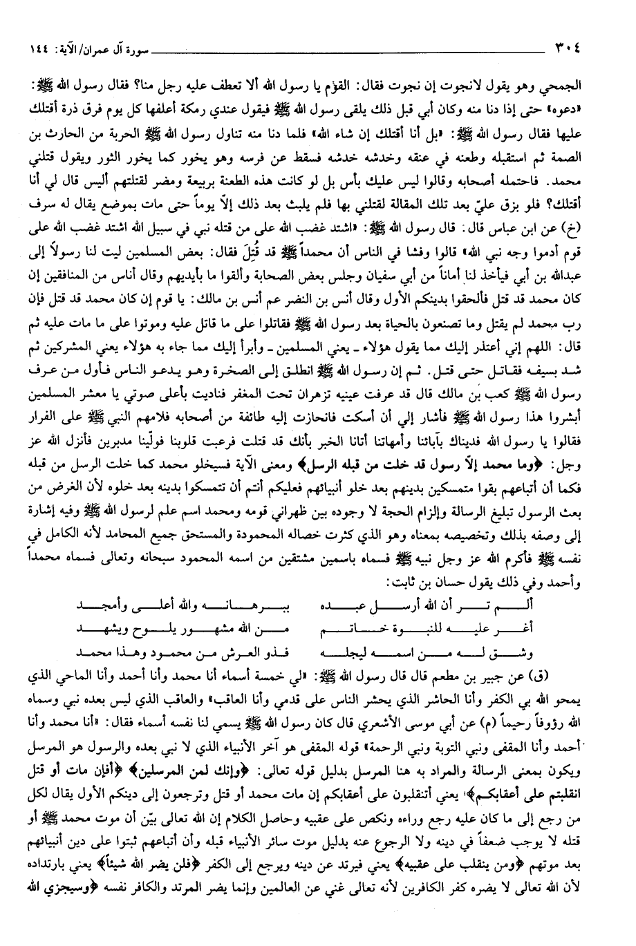 «دعوه» حتى إذا دنا منه وكان أبي قبل ذلك يلقى رسول الله صلّى الله عليه وسلّم فيقول عندي رمكة أعلفها كل يوم فرق ذرة أقتلك عليها فقال رسول الله صلّى الله عليه وسلّم: «بل أنا أقتلك إن شاء الله» فلما دنا منه تناول رسول الله صلّى الله عليه وسلّم الحربة من الحارث بن الصمة ثم استقبله وطعنه في عنقه وخدشه خدشه فسقط عن فرسه وهو يخور كما يخور الثور ويقول قتلني محمد. فاحتمله أصحابه وقالوا ليس عليك بأس بل لو كانت هذه الطعنة بربيعة ومضر لقتلتهم أليس قال لي أنا أقتلك؟ فلو بزق عليّ بعد تلك المقالة لقتلني بها فلم يلبث بعد ذلك إلّا يوما حتى مات بموضع يقال له سرف (خ) عن ابن عباس قال: قال رسول الله صلّى الله عليه وسلّم: «اشتد غضب الله على من قتله نبي في سبيل الله اشتد غضب الله على قوم أدموا وجه نبي الله» قالوا وفشا في الناس أن محمدا صلّى الله عليه وسلّم قد قتل فقال: بعض المسلمين ليت لنا رسولا إلى عبد الله بن أبي فيأخذ لنا أمانا من أبي سفيان وجلس بعض الصحابة وألقوا ما بأيديهم وقال أناس من المنافقين إن كان محمد قد قتل فألحقوا بدينكم الأول وقال أنس بن النضر عم أنس بن مالك: يا قوم إن كان محمد قد قتل فإن رب محمد لم يقتل وما تصنعون بالحياة بعد رسول الله صلّى الله عليه وسلّم فقاتلوا على ما قاتل عليه وموتوا على ما مات عليه ثم قال: اللهم إني أعتذر إليك مما يقول هؤلاء- يعني المسلمين- وأبرأ إليك مما جاء به هؤلاء يعني المشركين ثم شد بسيفه فقاتل حتى قتل. ثم إن رسول الله صلّى الله عليه وسلّم انطلق إلى الصخرة وهو يدعو الناس فأول من عرف رسول الله صلّى الله عليه وسلّم كعب بن مالك قال قد عرفت عينيه تزهران تحت المغفر فناديت بأعلى صوتي يا معشر المسلمين أبشروا هذا رسول الله صلّى الله عليه وسلّم فأشار إلي أن أسكت فانحازت إليه طائفة من أصحابه فلامهم النبي صلّى الله عليه وسلّم على الفرار فقالوا يا رسول الله فديناك بآبائنا وأمهاتنا أتانا الخبر بأنك قد قتلت فرعبت قلوبنا فولّينا مدبرين فأنزل الله عز وجل: وَما مُحَمَّدٌ إِلَّا رَسُولٌ قَدْ خَلَتْ مِنْ قَبْلِهِ الرُّسُلُ ومعنى الآية فسيخلو محمد كما خلت الرسل من قبله فكما أن أتباعهم بقوا متمسكين بدينهم بعد خلو أنبيائهم فعليكم أنتم أن تتمسكوا بدينه بعد خلوه لأن الغرض من بعث الرسول تبليغ الرسالة وإلزام الحجة لا وجوده بين ظهراني قومه ومحمد اسم علم لرسول الله صلّى الله عليه وسلّم وفيه إشارة إلى وصفه بذلك وتخصيصه بمعناه وهو الذي كثرت خصاله المحمودة والمستحق جميع المحامد لأنه الكامل في نفسه صلّى الله عليه وسلّم فأكرم الله عز وجل نبيه صلّى الله عليه وسلّم فسماه باسمين مشتقين من اسمه المحمود سبحانه وتعالى فسماه محمدا وأحمد وفي ذلك يقول حسان بن ثابت: