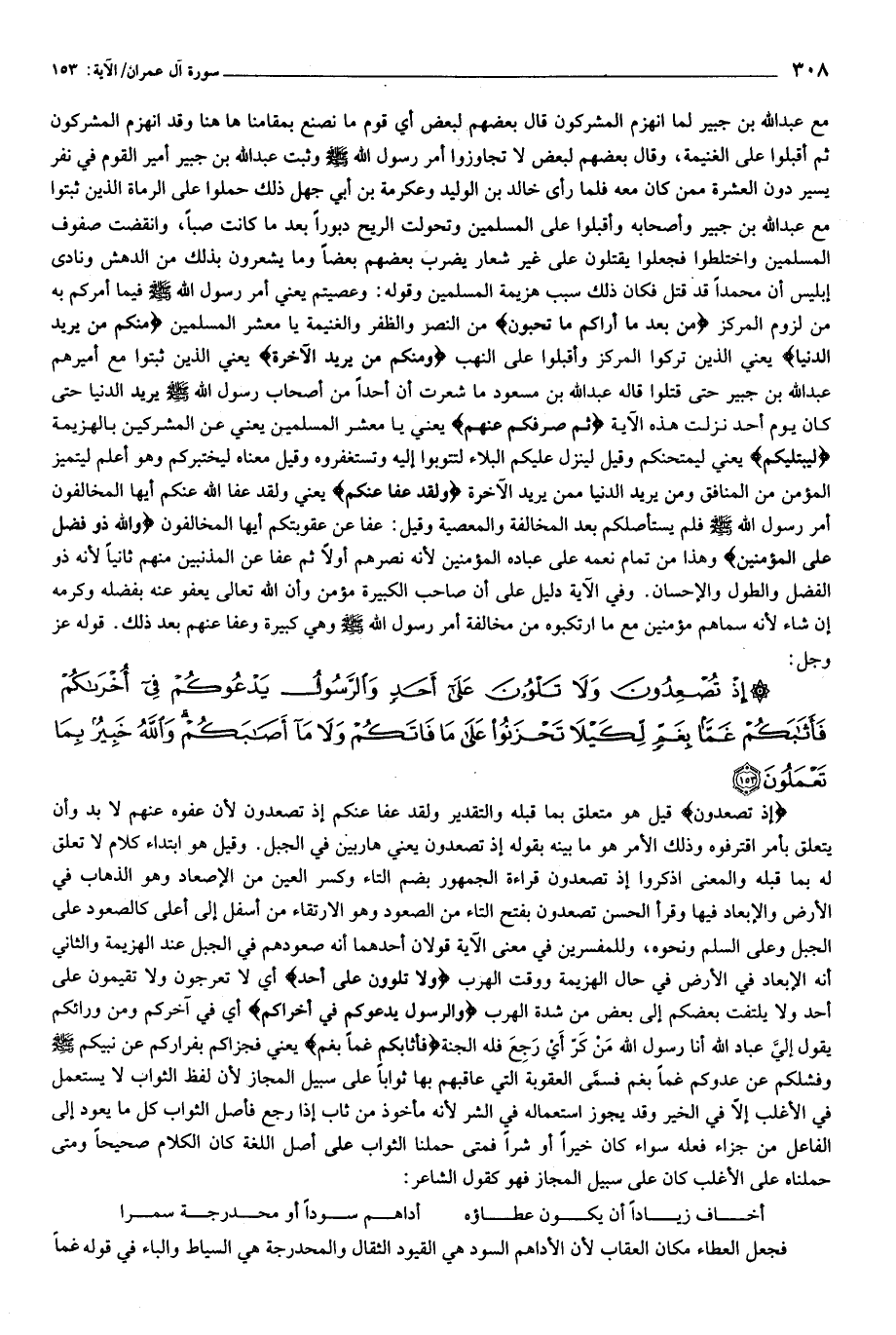 إِذْ تُصْعِدُونَ وَلا تَلْوُونَ عَلى أَحَدٍ وَالرَّسُولُ يَدْعُوكُمْ فِي أُخْراكُمْ فَأَثابَكُمْ غَمًّا بِغَمٍّ لِكَيْلا تَحْزَنُوا عَلى ما فاتَكُمْ وَلا ما أَصابَكُمْ وَاللَّهُ خَبِيرٌ بِما تَعْمَلُونَ (153)