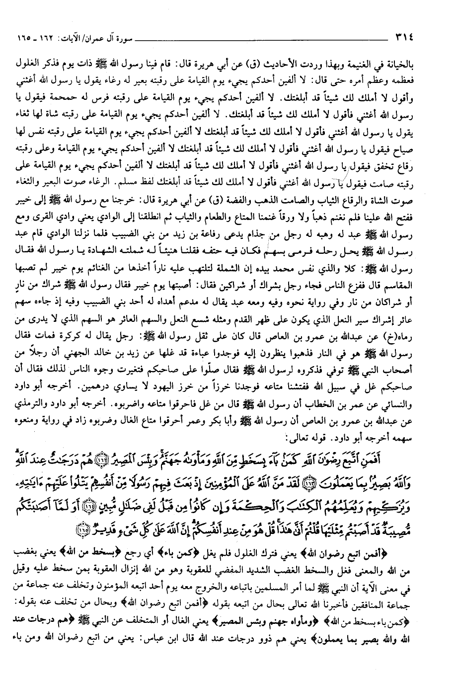 بالخيانة في الغنيمة وبهذا وردت الأحاديث (ق) عن أبي هريرة قال: قام فينا رسول الله صلّى الله عليه وسلّم ذات يوم فذكر الغلول فعظمه وعظم أمره حتى قال: لا ألفين أحدكم يجيء يوم القيامة على رقبته بعير له رغاء يقول يا رسول الله أغثني وأقول لا أملك لك شيئا قد أبلغتك. لا ألفين أحدكم يجيء يوم القيامة على رقبته فرس له حمحمة فيقول يا رسول الله أغثني فأقول لا أملك لك شيئا قد أبلغتك. لا ألفين أحدكم يجيء يوم القيامة على رقبته شاة لها ثغاء يقول يا رسول الله أغثني فأقول لا أملك لك شيئا قد أبلغتك لا ألفين أحدكم يجيء يوم القيامة على رقبته نفس لها صياح فيقول يا رسول الله أغثني فأقول لا أملك لك شيئا قد أبلغتك لا ألفين أحدكم يجيء يوم القيامة وعلى رقبته رقاع تخفق فيقول يا رسول الله أغثني فأقول لا أملك لك شيئا قد أبلغتك لا ألفين أحدكم يجيء يوم القيامة على رقبته صامت فيقول يا رسول الله أغثني فأقول لا أملك لك شيئا قد أبلغتك لفظ مسلم. الرغاء صوت البعير والثغاء صوت الشاة والرقاع الثياب والصامت الذهب والفضة (ق) عن أبي هريرة قال: خرجنا مع رسول الله صلّى الله عليه وسلّم إلى خيبر ففتح الله علينا فلم نغنم ذهبا ولا ورقا غنمنا المتاع والطعام والثياب ثم انطلقنا إلى الوادي يعني وادي القرى ومع رسول الله صلّى الله عليه وسلّم عبد له وهبه له رجل من جذام يدعى رفاعة بن زيد من بني الضبيب فلما نزلنا الوادي قام عبد رسول الله صلّى الله عليه وسلّم يحل رحله فرمى بسهم فكان فيه حتفه فقلنا هنيئا له شملته الشهادة يا رسول الله فقال رسول الله صلّى الله عليه وسلّم: كلا والذي نفس محمد بيده إن الشملة لتلتهب عليه نارا أخذها من الغنائم يوم خيبر لم تصبها المقاسم قال ففزع الناس فجاء رجل بشراك أو شراكين فقال: أصبتها يوم خيبر فقال رسول الله صلّى الله عليه وسلّم شراك من نار أو شراكان من نار وفي رواية نحوه وفيه ومعه عبد يقال له مدعم أهداه له أحد بني الضبيب وفيه إذ جاءه سهم عائر إشراك سير النعل الذي يكون على ظهر القدم ومثله شسع النعل والسهم العائر هو السهم الذي لا يدرى من رماه (خ) عن عبد الله بن عمرو بن العاص قال كان على ثقل رسول الله صلّى الله عليه وسلّم: رجل يقال له كركرة فمات فقال رسول الله صلّى الله عليه وسلّم هو في النار فذهبوا ينظرون إليه فوجدوا عباءة قد غلها عن زيد بن خالد الجهني أن رجلا من أصحاب النبي صلّى الله عليه وسلّم توفي فذكروه لرسول الله صلّى الله عليه وسلّم فقال صلّوا على صاحبكم فتغيرت وجوه الناس لذلك فقال أن صاحبكم غل في سبيل الله ففتشنا متاعه فوجدنا خرزا من خرز اليهود لا يساوي درهمين. أخرجه أبو داود والنسائي عن عمر بن الخطاب أن رسول الله صلّى الله عليه وسلّم قال من غل فاحرقوا متاعه واضربوه. أخرجه أبو داود والترمذي عن عبد الله بن عمرو بن العاص أن رسول الله صلّى الله عليه وسلّم وأبا بكر وعمر أحرقوا متاع الغال وضربوه زاد في رواية ومنعوه سهمه أخرجه أبو داود. قوله تعالى: