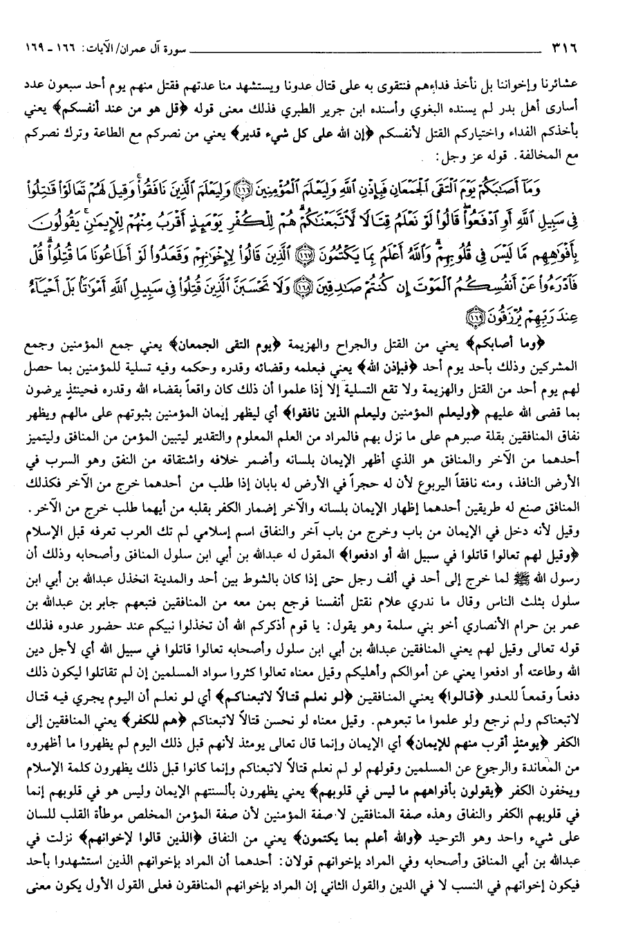 وَما أَصابَكُمْ يَوْمَ الْتَقَى الْجَمْعانِ فَبِإِذْنِ اللَّهِ وَلِيَعْلَمَ الْمُؤْمِنِينَ (166) وَلِيَعْلَمَ الَّذِينَ نافَقُوا وَقِيلَ لَهُمْ تَعالَوْا قاتِلُوا فِي سَبِيلِ اللَّهِ أَوِ ادْفَعُوا قالُوا لَوْ نَعْلَمُ قِتالاً لاتَّبَعْناكُمْ هُمْ لِلْكُفْرِ يَوْمَئِذٍ أَقْرَبُ مِنْهُمْ لِلْإِيمانِ يَقُولُونَ بِأَفْواهِهِمْ ما لَيْسَ فِي قُلُوبِهِمْ وَاللَّهُ أَعْلَمُ بِما يَكْتُمُونَ (167) الَّذِينَ قالُوا لِإِخْوانِهِمْ وَقَعَدُوا لَوْ أَطاعُونا ما قُتِلُوا قُلْ فَادْرَؤُا عَنْ أَنْفُسِكُمُ الْمَوْتَ إِنْ كُنْتُمْ صادِقِينَ (168) وَلا تَحْسَبَنَّ الَّذِينَ قُتِلُوا فِي سَبِيلِ اللَّهِ أَمْواتاً بَلْ أَحْياءٌ عِنْدَ رَبِّهِمْ يُرْزَقُونَ (169)