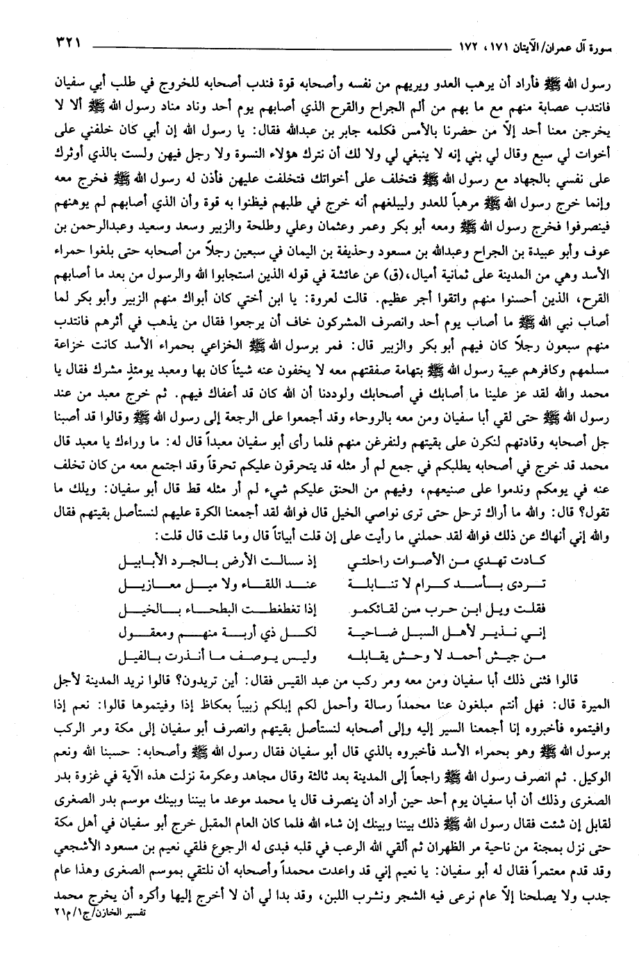 قالوا فثنى ذلك أبا سفيان ومن معه ومر ركب من عبد القيس فقال: أين تريدون؟ قالوا نريد المدينة لأجل الميرة قال: فهل أنتم مبلغون عنا محمدا رسالة وأحمل لكم إبلكم زبيبا بعكاظ إذا وفيتموها قالوا: نعم إذا وافيتموه فأخبروه إنا أجمعنا السير إليه وإلى أصحابه لنستأصل بقيتهم وانصرف أبو سفيان إلى مكة ومر الركب برسول الله صلّى الله عليه وسلّم وهو بحمراء الأسد فأخبروه بالذي قال أبو سفيان فقال رسول الله صلّى الله عليه وسلّم وأصحابه: حسبنا الله ونعم الوكيل. ثم انصرف رسول الله صلّى الله عليه وسلّم راجعا إلى المدينة بعد ثالثة وقال مجاهد وعكرمة نزلت هذه الآية في غزوة بدر الصغرى وذلك أن أبا سفيان يوم أحد حين أراد أن ينصرف قال يا محمد موعد ما بيننا وبينك موسم بدر الصغرى لقابل إن شئت فقال رسول الله صلّى الله عليه وسلّم ذلك بيننا وبينك إن شاء الله فلما كان العام المقبل خرج أبو سفيان في أهل مكة حتى نزل بمجنة من ناحية مر الظهران ثم ألقي الله الرعب في قلبه فبدا له الرجوع فلقي نعيم بن مسعود الأشجعي وقد قدم معتمرا فقال له أبو سفيان: يا نعيم إني قد واعدت محمدا وأصحابه أن نلتقي بموسم الصغرى وهذا عام جدب ولا يصلحنا إلّا عام نرعى فيه الشجر ونشرب اللبن، وقد بدا لي أن لا أخرج إليها وأكره أن يخرج محمد