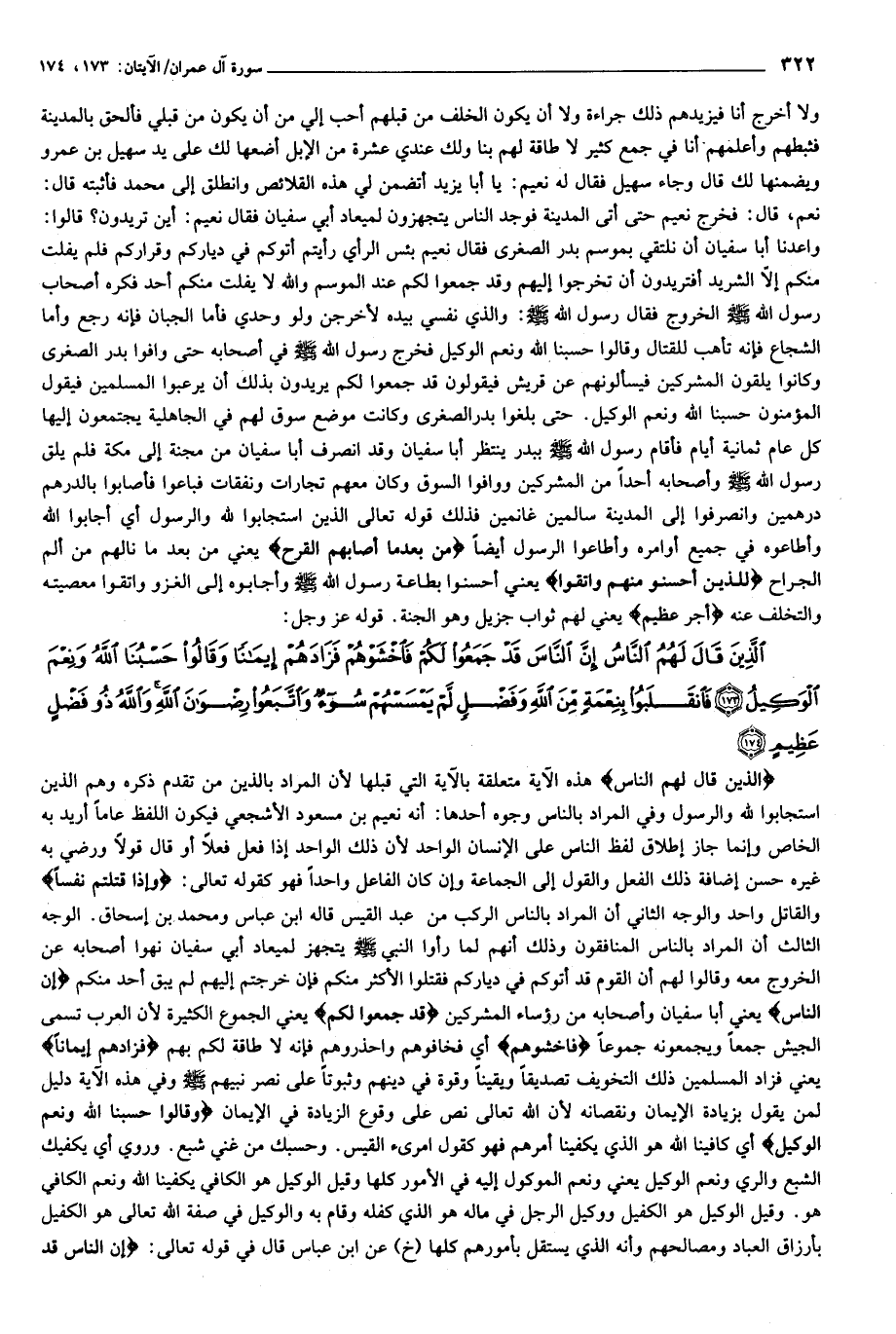 الَّذِينَ قالَ لَهُمُ النَّاسُ إِنَّ النَّاسَ قَدْ جَمَعُوا لَكُمْ فَاخْشَوْهُمْ فَزادَهُمْ إِيماناً وَقالُوا حَسْبُنَا اللَّهُ وَنِعْمَ الْوَكِيلُ (173) فَانْقَلَبُوا بِنِعْمَةٍ مِنَ اللَّهِ وَفَضْلٍ لَمْ يَمْسَسْهُمْ سُوءٌ وَاتَّبَعُوا رِضْوانَ اللَّهِ وَاللَّهُ ذُو فَضْلٍ عَظِيمٍ (174)