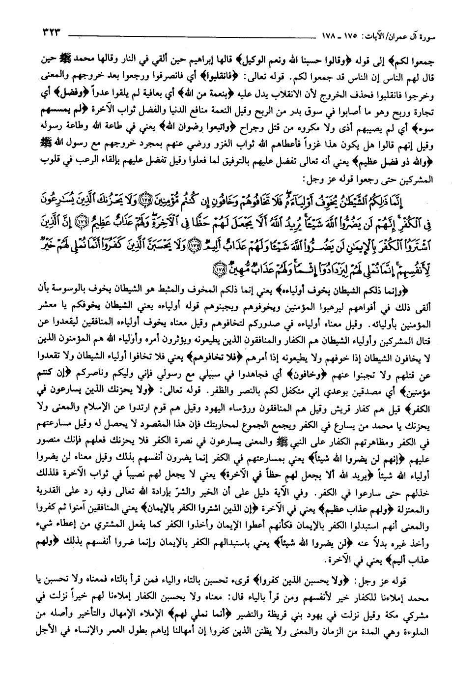 إِنَّما ذلِكُمُ الشَّيْطانُ يُخَوِّفُ أَوْلِياءَهُ يعني إنما ذلكم المخوف والمثبط هو الشيطان يخوف بالوسوسة بأن ألقى ذلك في أفواههم ليرهبوا المؤمنين ويخوفوهم ويجبنوهم قوله أولياءه يعني الشيطان يخوفكم يا معشر المؤمنين بأوليائه. وقيل معناه أولياءه في صدوركم لتخافوهم وقيل معناه يخوف أولياءه المنافقين ليقعدوا عن قتال المشركين وأولياء الشيطان هم الكفار والمنافقون الذين يطيعونه ويؤثرون أمره وأولياء الله هم المؤمنون الذين لا يخافون الشيطان إذا خوفهم ولا يطيعونه إذا أمرهم فَلا تَخافُوهُمْ يعني فلا تخافوا أولياء الشيطان ولا تقعدوا عن قتلهم ولا تجبنوا عنهم وَخافُونِ أي فجاهدوا في سبيلي مع رسولي فإني وليكم وناصركم إِنْ كُنْتُمْ مُؤْمِنِينَ أي مصدقين بوعدي إني متكفل لكم بالنصر والظفر. قوله تعالى: وَلا يَحْزُنْكَ الَّذِينَ يُسارِعُونَ فِي الْكُفْرِ قيل هم كفار قريش وقيل هم المنافقون ورؤساء اليهود وقيل هم قوم ارتدوا عن الإسلام والمعنى ولا يحزنك يا محمد من يسارع في الكفر ويجمع الجموع لمحاربتك فإن هذا المقصود لا يحصل له وقيل مسارعتهم في الكفر ومظاهرتهم الكفار على النبي صلّى الله عليه وسلّم والمعنى يسارعون في نصرة الكفر فلا يحزنك فعلهم فإنك منصور عليهم إِنَّهُمْ لَنْ يَضُرُّوا اللَّهَ شَيْئاً يعني بمسارعتهم في الكفر إنما يضرون أنفسهم بذلك وقيل معناه لن يضروا أولياء الله شيئا يُرِيدُ اللَّهُ أَلَّا يَجْعَلَ لَهُمْ حَظًّا فِي الْآخِرَةِ يعني لا يجعل لهم نصيبا في ثواب الآخرة فلذلك خذلهم حتى سارعوا في الكفر. وفي الآية دليل على أن الخير والشرّ بإرادة الله تعالى وفيه رد على القدرية والمعتزلة وَلَهُمْ عَذابٌ عَظِيمٌ يعني في الآخرة إِنَّ الَّذِينَ اشْتَرَوُا الْكُفْرَ بِالْإِيْمانِ يعني المنافقين آمنوا ثم كفروا والمعنى أنهم استبدلوا الكفر بالإيمان فكأنهم أعطوا الإيمان وأخذوا الكفر كما يفعل المشتري من إعطاء شيء وأخذ غيره بدلا عنه لَنْ يَضُرُّوا اللَّهَ شَيْئاً يعني باستبدالهم الكفر بالإيمان وإنما ضروا أنفسهم بذلك وَلَهُمْ عَذابٌ أَلِيمٌ يعني في الآخرة.