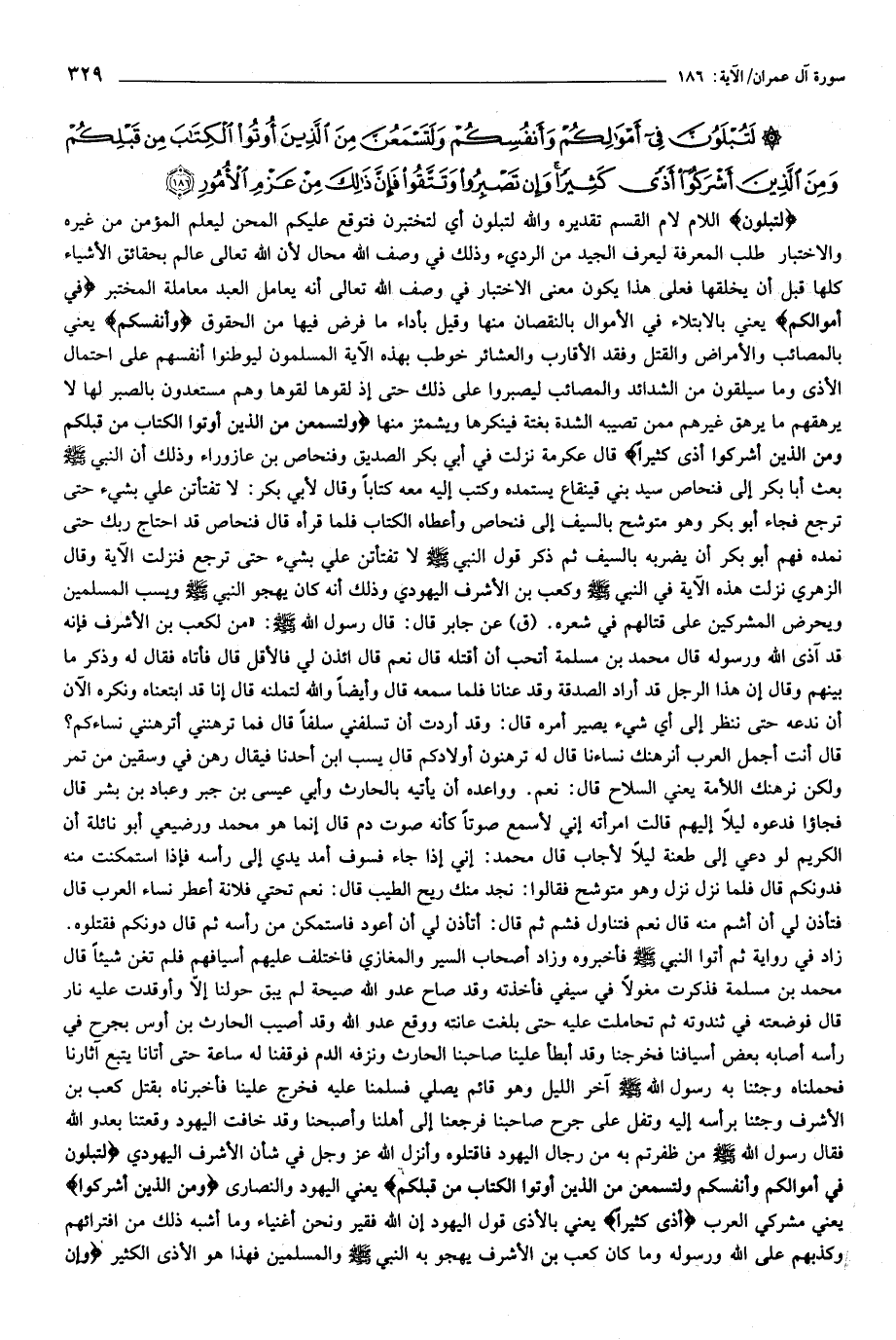 لَتُبْلَوُنَّ اللام لام القسم تقديره والله لتبلون أي لتختبرن فتوقع عليكم المحن ليعلم المؤمن من غيره والاختبار طلب المعرفة ليعرف الجيد من الرديء وذلك في وصف الله محال لأن الله تعالى عالم بحقائق الأشياء كلها قبل أن يخلقها فعلى هذا يكون معنى الاختبار في وصف الله تعالى أنه يعامل العبد معاملة المختبر فِي أَمْوالِكُمْ يعني بالابتلاء في الأموال بالنقصان منها وقيل بأداء ما فرض فيها من الحقوق وَأَنْفُسِكُمْ يعني بالمصائب والأمراض والقتل وفقد الأقارب والعشائر خوطب بهذه الآية المسلمون ليوطنوا أنفسهم على احتمال الأذى وما سيلقون من الشدائد والمصائب ليصبروا على ذلك حتى إذ لقوها لقوها وهم مستعدون بالصبر لها لا يرهقهم ما يرهق غيرهم ممن تصيبه الشدة بغتة فينكرها ويشمئز منها وَلَتَسْمَعُنَّ مِنَ الَّذِينَ أُوتُوا الْكِتابَ مِنْ قَبْلِكُمْ وَمِنَ الَّذِينَ أَشْرَكُوا أَذىً كَثِيراً قال عكرمة نزلت في أبي بكر الصديق وفنحاص بن عازوراء وذلك أن النبي صلّى الله عليه وسلّم بعث أبا بكر إلى فنحاص سيد بني قينقاع يستمده وكتب إليه معه كتابا وقال لأبي بكر: لا تفتاتن علي بشيء حتى ترجع فجاء أبو بكر وهو متوشح بالسيف إلى فنحاص وأعطاه الكتاب فلما قرأه قال فنحاص قد احتاج ربك حتى نمده فهم أبو بكر أن يضربه بالسيف ثم ذكر قول النبي صلّى الله عليه وسلّم لا تفتاتن علي بشيء حتى ترجع فنزلت الآية وقال الزهري نزلت هذه الآية في النبي صلّى الله عليه وسلّم وكعب بن الأشرف اليهودي وذلك أنه كان يهجو النبي صلّى الله عليه وسلّم ويسب المسلمين ويحرض المشركين على قتالهم في شعره. (ق) عن جابر قال: قال رسول الله صلّى الله عليه وسلّم: «من لكعب بن الأشرف فإنه قد آذى الله ورسوله قال محمد بن مسلمة أتحب أن أقتله قال نعم قال ائذن لي فالأقل قال فأتاه فقال له وذكر ما بينهم وقال إن هذا الرجل قد أراد الصدقة وقد عنانا فلما سمعه قال وأيضا والله لتملنه قال إنا قد ابتعناه ونكره الآن أن ندعه حتى ننظر إلى أي شيء يصير أمره قال: وقد أردت أن تسلفني سلفا قال فما ترهنني أترهنني نساءكم؟