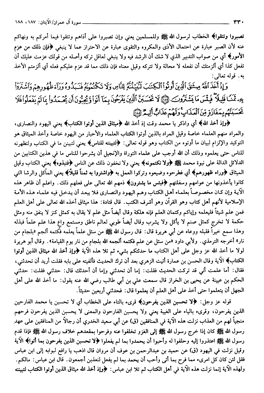 وَإِذْ أَخَذَ اللَّهُ مِيثاقَ الَّذِينَ أُوتُوا الْكِتابَ لَتُبَيِّنُنَّهُ لِلنَّاسِ وَلا تَكْتُمُونَهُ فَنَبَذُوهُ وَراءَ ظُهُورِهِمْ وَاشْتَرَوْا بِهِ ثَمَناً قَلِيلاً فَبِئْسَ ما يَشْتَرُونَ (187) لا تَحْسَبَنَّ الَّذِينَ يَفْرَحُونَ بِما أَتَوْا وَيُحِبُّونَ أَنْ يُحْمَدُوا بِما لَمْ يَفْعَلُوا فَلا تَحْسَبَنَّهُمْ بِمَفازَةٍ مِنَ الْعَذابِ وَلَهُمْ عَذابٌ أَلِيمٌ (188)
