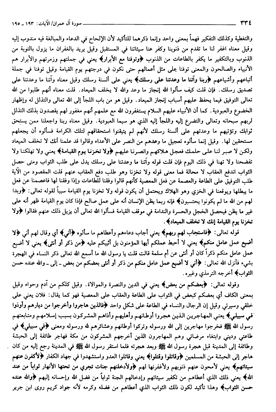 وقوله تعالى: بَعْضُكُمْ مِنْ بَعْضٍ يعني في الدين والنصرة والموالاة. وقيل كلكم من آدم وحواء وقيل بمعنى الكاف أي بعضكم كبعض في الثواب على الطاعة والعقاب على المعصية فهو كما يقال: فلان يعني على خلقي وسيرتي وقيل إن الرجال والنساء في الطاعة على شكل واحد فَالَّذِينَ هاجَرُوا وَأُخْرِجُوا مِنْ دِيارِهِمْ وَأُوذُوا فِي سَبِيلِي يعني المهاجرين الذين هجروا أوطانهم وأهليهم وأذاهم المشركون بسبب إسلامهم ومتابعتهم رسول الله صلّى الله عليه وسلّم فخرجوا مهاجرين إلى الله ورسوله وتركوا أوطانهم وعشائرهم لله ورسوله ومعنى فِي سَبِيلِي في طاعتي وديني وابتغاء مرضاتي وهم المهاجرون الذين أخرجهم المشركون من مكة فهاجر طائفة إلى الحبشة وطائفة إلى المدينة قبل هجرة رسول الله صلّى الله عليه وسلّم وبعد هجرته فلما استقر رسول الله صلّى الله عليه وسلّم في المدينة رجع إليه من كان هاجر إلى الحبشة من المسلمين وَقاتَلُوا وَقُتِلُوا يعني وقاتلوا العدو واستشهدوا في جهاد الكفار لَأُكَفِّرَنَّ عَنْهُمْ سَيِّئاتِهِمْ يعني لأمحون عنهم ذنوبهم ولأغفرنها لهم وَلَأُدْخِلَنَّهُمْ جَنَّاتٍ تَجْرِي مِنْ تَحْتِهَا الْأَنْهارُ ثَواباً مِنْ عِنْدِ اللَّهِ يعني ذلك الذي أعطاهم من تكفير سيئاتهم وإدخالهم الجنة ثوابا من فضل الله وإحسانه إليهم وَاللَّهُ عِنْدَهُ حُسْنُ الثَّوابِ وهذا تأكيد لكون ذلك الثواب الذي أعطاهم من فضله وكرمه لأنه جواد كريم روى ابن جرير