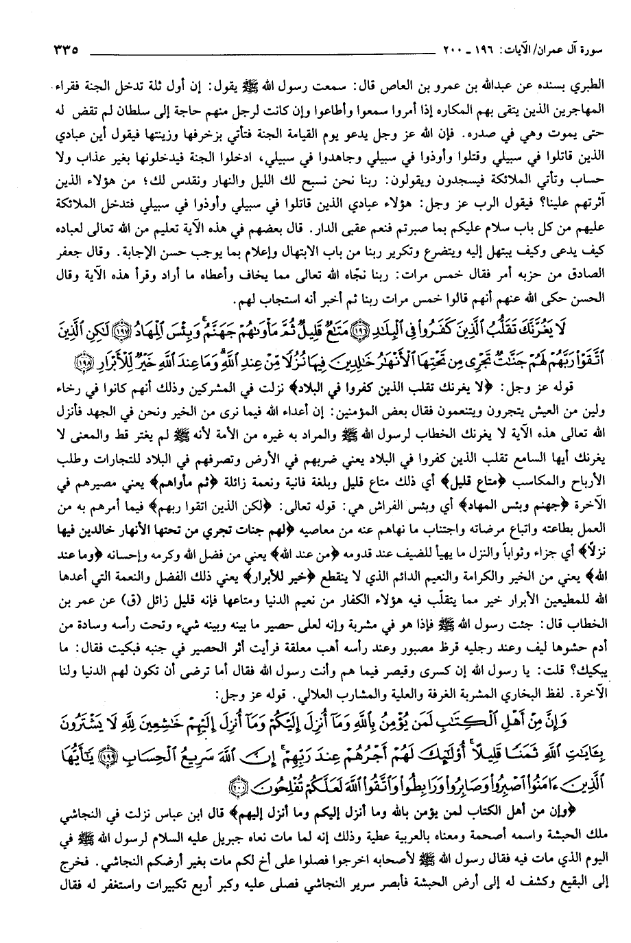 وَإِنَّ مِنْ أَهْلِ الْكِتابِ لَمَنْ يُؤْمِنُ بِاللَّهِ وَما أُنْزِلَ إِلَيْكُمْ وَما أُنْزِلَ إِلَيْهِمْ خاشِعِينَ لِلَّهِ لا يَشْتَرُونَ بِآياتِ اللَّهِ ثَمَناً قَلِيلاً أُولئِكَ لَهُمْ أَجْرُهُمْ عِنْدَ رَبِّهِمْ إِنَّ اللَّهَ سَرِيعُ الْحِسابِ (199) يا أَيُّهَا الَّذِينَ آمَنُوا اصْبِرُوا وَصابِرُوا وَرابِطُوا وَاتَّقُوا اللَّهَ لَعَلَّكُمْ تُفْلِحُونَ (200)