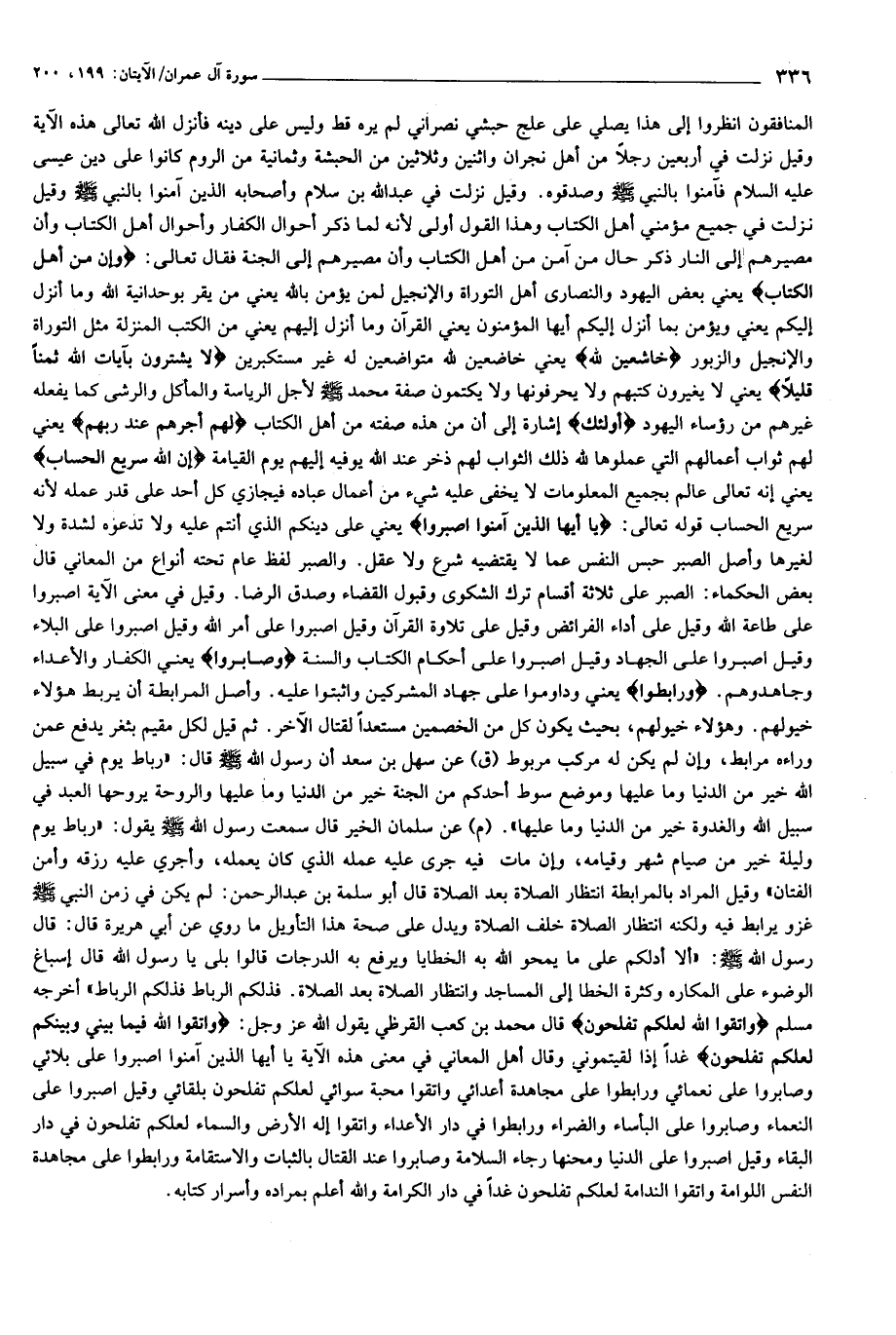 المنافقون انظروا إلى هذا يصلي على علج حبشي نصراني لم يره قط وليس على دينه فأنزل الله تعالى هذه الآية وقيل نزلت في أربعين رجلا من أهل نجران واثنين وثلاثين من الحبشة وثمانية من الروم كانوا على دين عيسى عليه السلام فآمنوا بالنبي صلّى الله عليه وسلّم وصدقوه. وقيل نزلت في عبد الله بن سلام وأصحابه الذين آمنوا بالنبي صلّى الله عليه وسلّم وقيل نزلت في جميع مؤمني أهل الكتاب وهذا القول أولى لأنه لما ذكر أحوال الكفار وأحوال أهل الكتاب وأن مصيرهم إلى النار ذكر حال من آمن من أهل الكتاب وأن مصيرهم إلى الجنة فقال تعالى: وَإِنَّ مِنْ أَهْلِ الْكِتابِ يعني بعض اليهود والنصارى أهل التوراة والإنجيل لمن يؤمن بالله يعني من يقر بوحدانية الله وما أنزل إليكم يعني ويؤمن بما أنزل إليكم أيها المؤمنون يعني القرآن وما أنزل إليهم يعني من الكتب المنزلة مثل التوراة والإنجيل والزبور خاشِعِينَ لِلَّهِ يعني خاضعين لله متواضعين له غير مستكبرين لا يَشْتَرُونَ بِآياتِ اللَّهِ ثَمَناً قَلِيلًا يعني لا يغيرون كتبهم ولا يحرفونها ولا يكتمون صفة محمد صلّى الله عليه وسلّم لأجل الرياسة والمأكل والرشى كما يفعله غيرهم من رؤساء اليهود أُولئِكَ إشارة إلى أن من هذه صفته من أهل الكتاب لَهُمْ أَجْرُهُمْ عِنْدَ رَبِّهِمْ يعني لهم ثواب أعمالهم التي عملوها لله ذلك الثواب لهم ذخر عند الله يوفيه إليهم يوم القيامة إِنَّ اللَّهَ سَرِيعُ الْحِسابِ يعني إنه تعالى عالم بجميع المعلومات لا يخفى عليه شيء من أعمال عباده فيجازي كل أحد على قدر عمله لأنه سريع الحساب قوله تعالى: يا أَيُّهَا الَّذِينَ آمَنُوا اصْبِرُوا يعني على دينكم الذي أنتم عليه ولا تدعوه لشدة ولا لغيرها وأصل الصبر حبس النفس عما لا يقتضيه شرع ولا عقل. والصبر لفظ عام تحته أنواع من المعاني قال بعض الحكماء: الصبر على ثلاثة أقسام ترك الشكوى وقبول القضاء وصدق الرضا. وقيل في معنى الآية اصبروا على طاعة الله وقيل على أداء الفرائض وقيل على تلاوة القرآن وقيل اصبروا على أمر الله وقيل اصبروا على البلاء وقيل اصبروا على الجهاد وقيل اصبروا على أحكام الكتاب والسنة وَصابِرُوا يعني الكفار والأعداء وجاهدوهم. وَرابِطُوا يعني وداوموا على جهاد المشركين واثبتوا عليه. وأصل المرابطة أن يربط هؤلاء خيولهم. وهؤلاء خيولهم، بحيث يكون كل من الخصمين مستعدا لقتال الآخر. ثم قيل لكل مقيم بثغر يدفع عمن وراءه مرابط، وإن لم يكن له مركب مربوط (ق) عن سهل بن سعد أن رسول الله صلّى الله عليه وسلّم قال: «رباط يوم في سبيل الله خير من الدنيا وما عليها وموضع سوط أحدكم من الجنة خير من الدنيا وما عليها والروحة يروحها العبد في سبيل الله والغدوة خير من الدنيا وما عليها». (م) عن سلمان الخير قال سمعت رسول الله صلّى الله عليه وسلّم يقول: «رباط يوم وليلة خير من صيام شهر وقيامه، وإن مات فيه جرى عليه عمله الذي كان يعمله، وأجري عليه رزقه وأمن الفتان» وقيل المراد بالمرابطة انتظار الصلاة بعد الصلاة قال أبو سلمة بن عبد الرحمن: لم يكن في زمن النبي صلّى الله عليه وسلّم غزو يرابط فيه ولكنه انتظار الصلاة خلف الصلاة ويدل على صحة هذا التأويل ما روي عن أبي هريرة قال: قال رسول الله صلّى الله عليه وسلّم: «ألا أدلكم على ما يمحو الله به الخطايا ويرفع به الدرجات قالوا بلى يا رسول الله قال إسباغ الوضوء على المكاره وكثرة الخطا إلى المساجد وانتظار الصلاة بعد الصلاة. فذلكم الرباط فذلكم الرباط» أخرجه مسلم وَاتَّقُوا اللَّهَ لَعَلَّكُمْ تُفْلِحُونَ قال محمد بن كعب