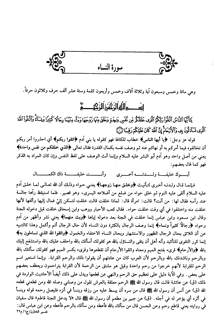 يا أَيُّهَا النَّاسُ اتَّقُوا رَبَّكُمُ الَّذِي خَلَقَكُمْ مِنْ نَفْسٍ واحِدَةٍ وَخَلَقَ مِنْها زَوْجَها وَبَثَّ مِنْهُما رِجالاً كَثِيراً وَنِساءً وَاتَّقُوا اللَّهَ الَّذِي تَسائَلُونَ بِهِ وَالْأَرْحامَ إِنَّ اللَّهَ كانَ عَلَيْكُمْ رَقِيباً (1)