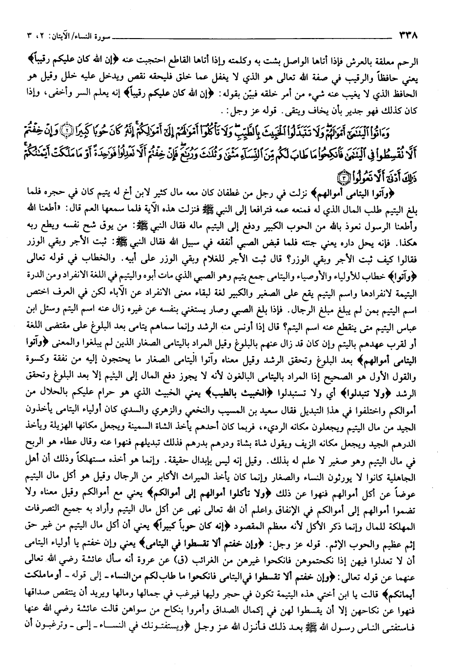 وَآتُوا الْيَتامى أَمْوالَهُمْ وَلا تَتَبَدَّلُوا الْخَبِيثَ بِالطَّيِّبِ وَلا تَأْكُلُوا أَمْوالَهُمْ إِلى أَمْوالِكُمْ إِنَّهُ كانَ حُوباً كَبِيراً (2) وَإِنْ خِفْتُمْ أَلاَّ تُقْسِطُوا فِي الْيَتامى فَانْكِحُوا ما طابَ لَكُمْ مِنَ النِّساءِ مَثْنى وَثُلاثَ وَرُباعَ فَإِنْ خِفْتُمْ أَلاَّ تَعْدِلُوا فَواحِدَةً أَوْ ما مَلَكَتْ أَيْمانُكُمْ ذلِكَ أَدْنى أَلاَّ تَعُولُوا (3)