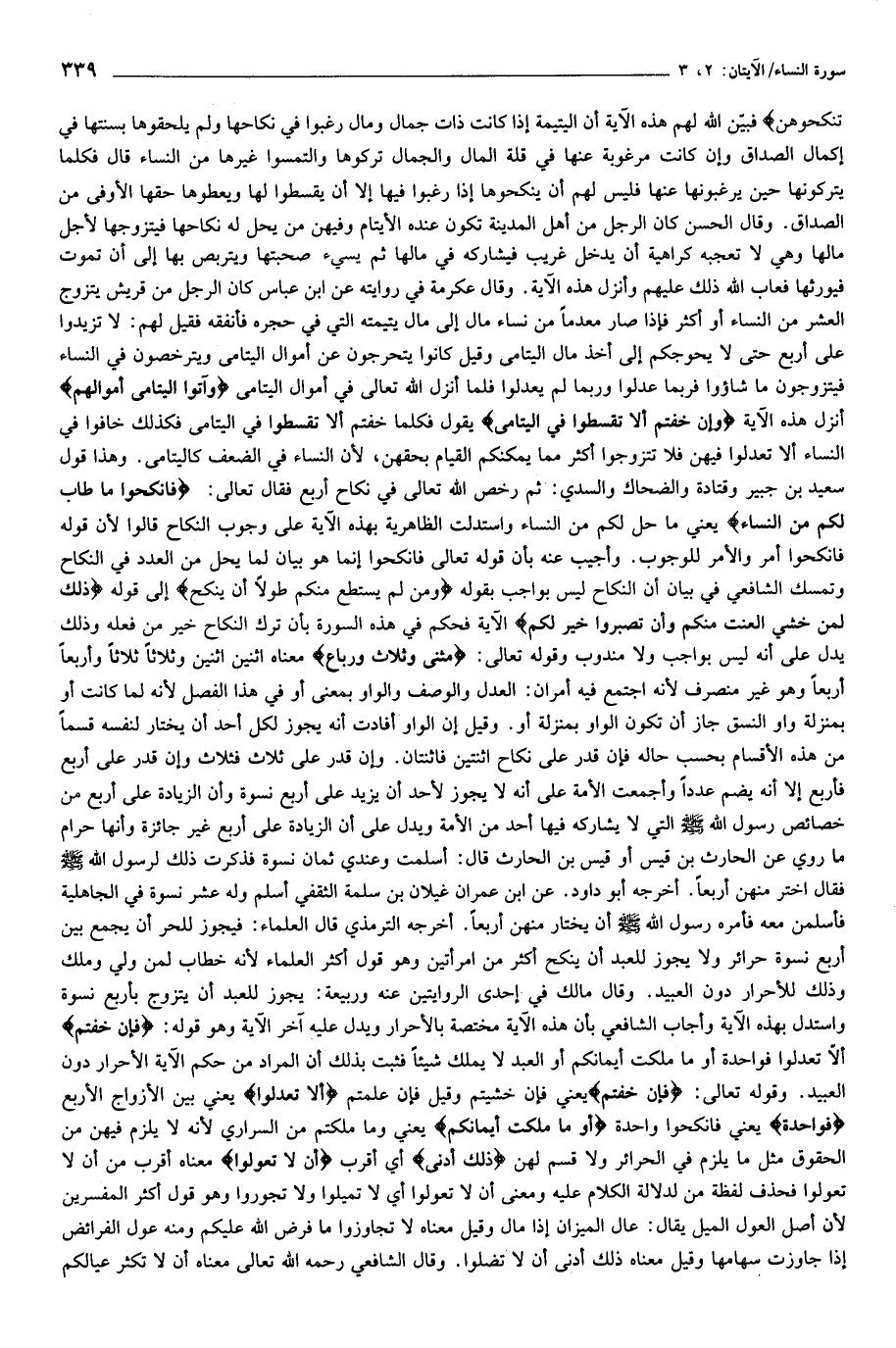 هذه الآية. وقال عكرمة في روايته عن ابن عباس كان الرجل من قريش يتزوج العشر من النساء أو أكثر فإذا صار معدما من نساء مال إلى مال يتيمته التي في حجره فأنفقه فقيل لهم: لا تزيدوا على أربع حتى لا يحوجكم إلى أخذ مال اليتامى وقيل كانوا يتحرجون عن أموال اليتامى ويترخصون في النساء فيتزوجون ما شاؤوا فربما عدلوا وربما لم يعدلوا فلما أنزل الله تعالى في أموال اليتامى وَآتُوا الْيَتامى أَمْوالَهُمْ أنزل هذه الآية وَإِنْ خِفْتُمْ أَلَّا تُقْسِطُوا فِي الْيَتامى يقول فكلما خفتم ألا تقسطوا في اليتامى فكذلك خافوا في النساء ألا تعدلوا فيهن فلا تتزوجوا أكثر مما يمكنكم القيام بحقهن، لأن النساء في الضعف كاليتامى. وهذا قول سعيد بن جبير وقتادة والضحاك والسدي: ثم رخص الله تعالى في نكاح أربع فقال تعالى: فَانْكِحُوا ما طابَ لَكُمْ مِنَ النِّساءِ يعني ما حل لكم من النساء واستدلت الظاهرية بهذه الآية على وجوب النكاح قالوا لأن قوله فانكحوا أمر والأمر للوجوب. وأجيب عنه بأن قوله تعالى فانكحوا إنما هو بيان لما يحل من العدد في النكاح وتمسك الشافعي في بيان أن النكاح ليس بواجب بقوله وَمَنْ لَمْ يَسْتَطِعْ مِنْكُمْ طَوْلًا أَنْ يَنْكِحَ إلى قوله ذلِكَ لِمَنْ خَشِيَ الْعَنَتَ مِنْكُمْ وَأَنْ تَصْبِرُوا خَيْرٌ لَكُمْ الآية فحكم في هذه السورة بأن ترك النكاح خير من فعله وذلك يدل على أنه ليس بواجب ولا مندوب وقوله تعالى: مَثْنى وَثُلاثَ وَرُباعَ معناه اثنين اثنين وثلاثا ثلاثا وأربعا أربعا وهو غير منصرف لأنه اجتمع فيه أمران: العدل والوصف والواو بمعنى أو في هذا الفصل لأنه لما كانت أو بمنزلة واو النسق جاز أن تكون الواو بمنزلة أو. وقيل إن الواو أفادت أنه يجوز لكل أحد أن يختار لنفسه قسما من هذه الأقسام بحسب حاله فإن قدر على نكاح اثنتين فاثنتان. وإن قدر على ثلاث فثلاث وإن قدر على أربع فأربع إلا أنه يضم عددا وأجمعت الأمة على أنه لا يجوز لأحد أن يزيد على أربع نسوة وأن الزيادة على أربع من خصائص رسول الله صلّى الله عليه وسلّم التي لا يشاركه فيها أحد من الأمة ويدل على أن الزيادة على أربع غير جائزة وأنها حرام ما روي عن الحارث بن قيس أو قيس بن الحارث قال: أسلمت وعندي ثمان نسوة فذكرت ذلك لرسول الله صلّى الله عليه وسلّم فقال اختر منهن أربعا. أخرجه أبو داود. عن ابن عمران غيلان بن سلمة الثقفي أسلم وله عشر نسوة في الجاهلية فأسلمن معه فأمره رسول الله صلّى الله عليه وسلّم أن يختار منهن أربعا. أخرجه الترمذي قال العلماء: فيجوز للحر أن يجمع بين أربع نسوة حرائر ولا يجوز للعبد أن ينكح أكثر من امرأتين وهو قول أكثر العلماء لأنه خطاب لمن ولي وملك وذلك للأحرار دون العبيد. وقال مالك في إحدى الروايتين عنه وربيعة: يجوز للعبد أن يتزوج بأربع نسوة واستدل بهذه الآية وأجاب الشافعي بأن هذه الآية مختصة بالأحرار ويدل عليه آخر الآية وهو قوله: فَإِنْ خِفْتُمْ ألّا تعدلوا فواحدة أو ما ملكت أيمانكم أو العبد لا يملك شيئا فثبت بذلك أن المراد من حكم الآية الأحرار دون العبيد. وقوله تعالى: فَإِنْ خِفْتُمْ يعني فإن خشيتم وقيل فإن علمتم أَلَّا تَعْدِلُوا يعني بين الأزواج الأربع فَواحِدَةً يعني فانكحوا واحدة أَوْ ما مَلَكَتْ أَيْمانُكُمْ يعني وما ملكتم من السراري لأنه لا يلزم فيهن من الحقوق مثل ما يلزم في الحرائر ولا قسم لهن ذلِكَ أَدْنى أي أقرب أَلَّا تَعُولُوا معناه أقرب من أن لا تعولوا فحذف لفظة من لدلالة الكلام عليه ومعنى أن لا تعولوا أي لا تميلوا ولا تجوروا وهو قول أكثر المفسرين لأن أصل العول الميل يقال: عال الميزان إذا مال وقيل معناه لا تجاوزوا ما فرض الله عليكم ومنه عول الفرائض إذا جاوزت سهامها وقيل معناه ذلك أدنى أن لا تضلوا. وقال الشافعي رحمه الله تعالى معناه أن لا تكثر عيالكم