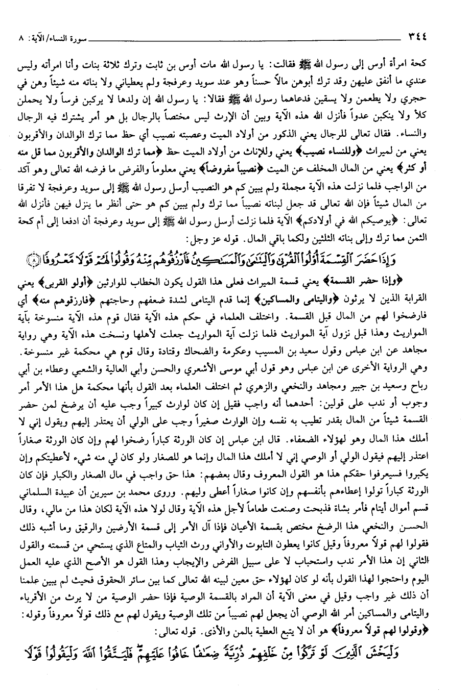 كحة امرأة أوس إلى رسول الله صلّى الله عليه وسلّم فقالت: يا رسول الله مات أوس بن ثابت وترك ثلاثة بنات وأنا امرأته وليس عندي ما أنفق عليهن وقد ترك أبوهن مالا حسنا وهو عند سويد وعرفجة ولم يعطياني ولا بناته منه شيئا وهن في حجري ولا يطعمن ولا يسقين فدعاهما رسول الله صلّى الله عليه وسلّم فقالا: يا رسول الله إن ولدها لا يركبن فرسا ولا يحملن كلأ ولا ينكبن عدوا فأنزل الله هذه الآية وبين أن الإرث ليس مختصا بالرجال بل هو أمر يشترك فيه الرجال والنساء. فقال تعالى للرجال يعني الذكور من أولاد الميت وعصبته نصيب أي حظ مما ترك الوالدان والأقربون يعني من لميراث وَلِلنِّساءِ نَصِيبٌ يعني وللإناث من أولاد الميت حظ مِمَّا تَرَكَ الْوالِدانِ وَالْأَقْرَبُونَ مِمَّا قَلَّ مِنْهُ أَوْ كَثُرَ يعني من المال المخلف عن الميت نَصِيباً مَفْرُوضاً يعني معلوما والفرض ما فرضه الله تعالى وهو آكد من الواجب فلما نزلت هذه الآية مجملة ولم يبين كم هو النصيب أرسل رسول الله صلّى الله عليه وسلّم إلى سويد وعرفجة لا تفرقا من المال شيئا فإن الله تعالى قد جعل لبناته نصيبا مما ترك ولم يبين كم هو حتى أنظر ما ينزل فيهن فأنزل الله تعالى: يُوصِيكُمُ اللَّهُ فِي أَوْلادِكُمْ الآية فلما نزلت أرسل رسول الله صلّى الله عليه وسلّم إلى سويد وعرفجة أن ادفعا إلى أم كحة الثمن مما ترك وإلى بناته الثلثين ولكما باقي المال. قوله عز وجل: