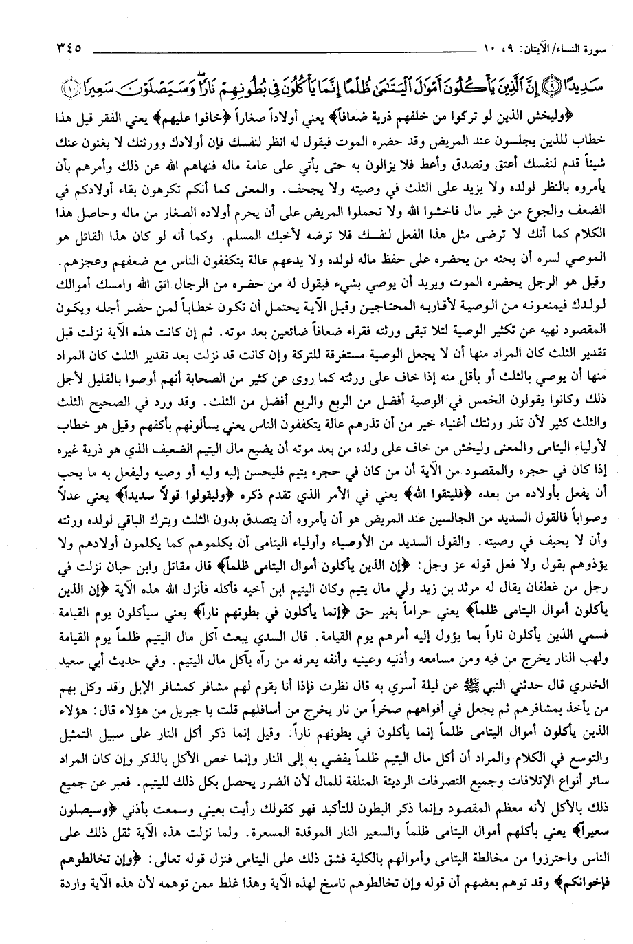 وَلْيَخْشَ الَّذِينَ لَوْ تَرَكُوا مِنْ خَلْفِهِمْ ذُرِّيَّةً ضِعافاً خافُوا عَلَيْهِمْ فَلْيَتَّقُوا اللَّهَ وَلْيَقُولُوا قَوْلاً سَدِيداً (9) إِنَّ الَّذِينَ يَأْكُلُونَ أَمْوالَ الْيَتامى ظُلْماً إِنَّما يَأْكُلُونَ فِي بُطُونِهِمْ ناراً وَسَيَصْلَوْنَ سَعِيراً (10)