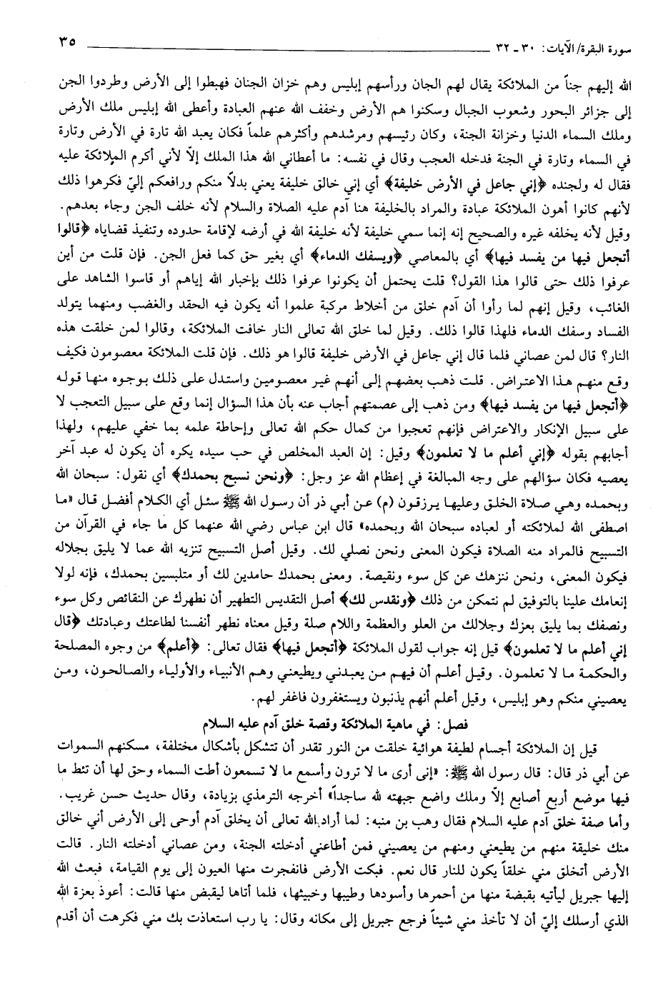 (فصل: في ماهية الملائكة وقصة خلق آدم عليه السلام) قيل إن الملائكة أجسام لطيفة هوائية خلقت من النور تقدر أن تتشكل بأشكال مختلفة، مسكنهم السموات عن أبي ذر قال: قال رسول الله صلّى الله عليه وسلّم: «إنى أرى ما لا ترون وأسمع ما لا تسمعون أطت السماء وحق لها أن تئط ما فيها موضع أربع أصابع إلّا وملك واضع جبهته لله ساجدا» أخرجه الترمذي بزيادة، وقال حديث حسن غريب.