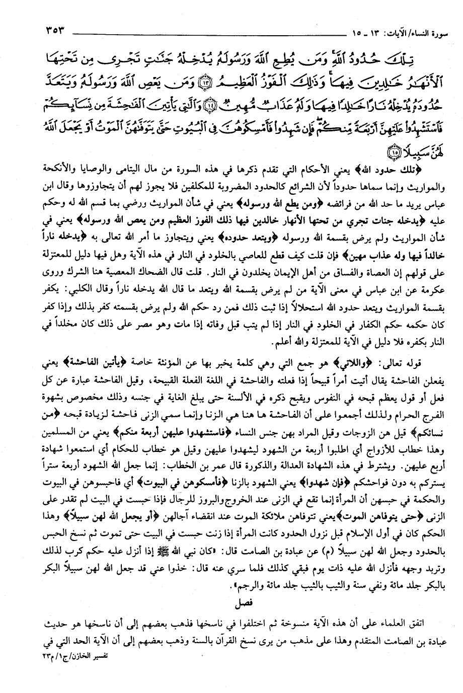 تِلْكَ حُدُودُ اللَّهِ وَمَنْ يُطِعِ اللَّهَ وَرَسُولَهُ يُدْخِلْهُ جَنَّاتٍ تَجْرِي مِنْ تَحْتِهَا الْأَنْهارُ خالِدِينَ فِيها وَذلِكَ الْفَوْزُ الْعَظِيمُ (13) وَمَنْ يَعْصِ اللَّهَ وَرَسُولَهُ وَيَتَعَدَّ حُدُودَهُ يُدْخِلْهُ ناراً خالِداً فِيها وَلَهُ عَذابٌ مُهِينٌ (14) وَاللاَّتِي يَأْتِينَ الْفاحِشَةَ مِنْ نِسائِكُمْ فَاسْتَشْهِدُوا عَلَيْهِنَّ أَرْبَعَةً مِنْكُمْ فَإِنْ شَهِدُوا فَأَمْسِكُوهُنَّ فِي الْبُيُوتِ حَتَّى يَتَوَفَّاهُنَّ الْمَوْتُ أَوْ يَجْعَلَ اللَّهُ لَهُنَّ سَبِيلاً (15)