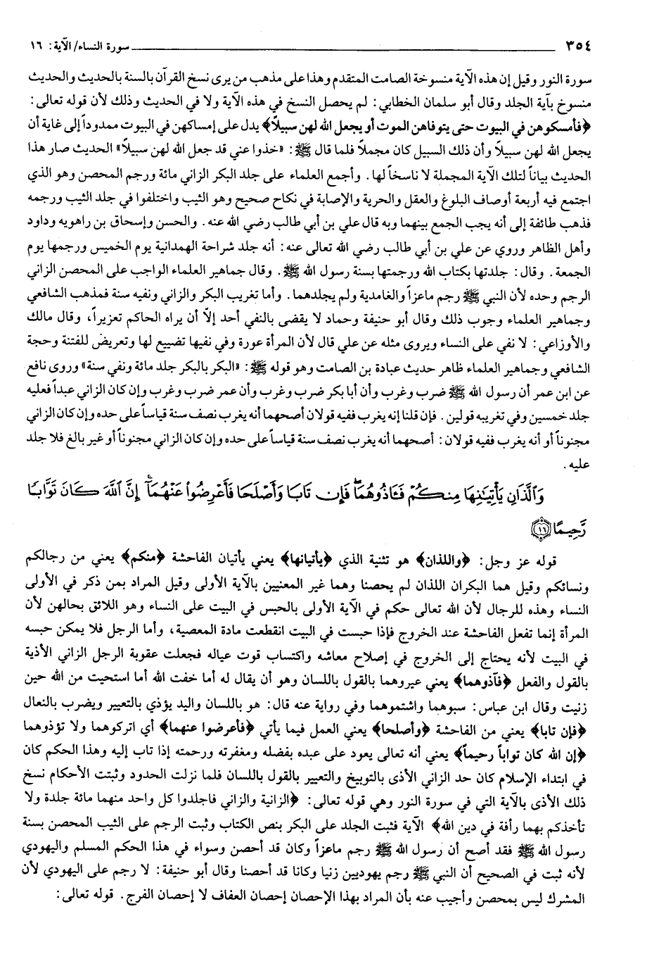 فَأَمْسِكُوهُنَّ فِي الْبُيُوتِ حَتَّى يَتَوَفَّاهُنَّ الْمَوْتُ أَوْ يَجْعَلَ اللَّهُ لَهُنَّ سَبِيلًا يدل على إمساكهن في البيوت ممدودا إلى غاية أن يجعل الله لهن سبيلا وأن ذلك السبيل كان مجملا فلما قال صلّى الله عليه وسلّم: «خذوا عني قد جعل الله لهن سبيلا» الحديث صار هذا الحديث بيانا لتلك الآية المجملة لا ناسخا لها. وأجمع العلماء على جلد البكر الزاني مائة ورجم المحصن وهو الذي اجتمع فيه أربعة أوصاف البلوغ والعقل والحرية والإصابة في نكاح صحيح وهو الثيب واختلفوا في جلد الثيب ورجمه فذهب طائفة إلى أنه يجب الجمع بينهما وبه قال علي بن أبي طالب رضي الله عنه. والحسن وإسحاق بن راهويه وداود وأهل الظاهر وروي عن علي بن أبي طالب رضي الله تعالى عنه: أنه جلد شراحة الهمدانية يوم الخميس ورجمها يوم الجمعة. وقال: جلدتها بكتاب الله ورجمتها بسنة رسول الله صلّى الله عليه وسلّم. وقال جماهير العلماء الواجب على المحصن الزاني الرجم وحده لأن النبي صلّى الله عليه وسلّم رجم ماعزا والغامدية ولم يجلدهما. وأما تغريب البكر والزاني ونفيه سنة فمذهب الشافعي وجماهير العلماء وجوب ذلك وقال أبو حنيفة وحماد لا يقضى بالنفي أحد إلّا أن يراه الحاكم تعزيرا، وقال مالك والأوزاعي: لا نفي على النساء ويروى مثله عن علي قال لأن المرأة عورة وفي نفيها تضييع لها وتعريض للفتنة وحجة الشافعي وجماهير العلماء ظاهر حديث عبادة بن الصامت وهو قوله صلّى الله عليه وسلّم: «البكر بالبكر جلد مائة ونفي سنة» وروى نافع عن ابن عمر أن رسول الله صلّى الله عليه وسلّم ضرب وغرب وأن أبا بكر ضرب وغرب وأن عمر ضرب وغرب وإن كان الزاني عبدا فعليه جلد خمسين وفي تغريبه قولين. فإن قلنا إنه يغرب ففيه قولان أصحهما أنه يغرب نصف سنة قياسا على حده وإن كان الزاني مجنونا أو أنه يغرب ففيه قولان: أصحهما أنه يغرب نصف سنة قياسا على حده وإن كان الزاني مجنونا أو غير بالغ فلا جلد عليه.