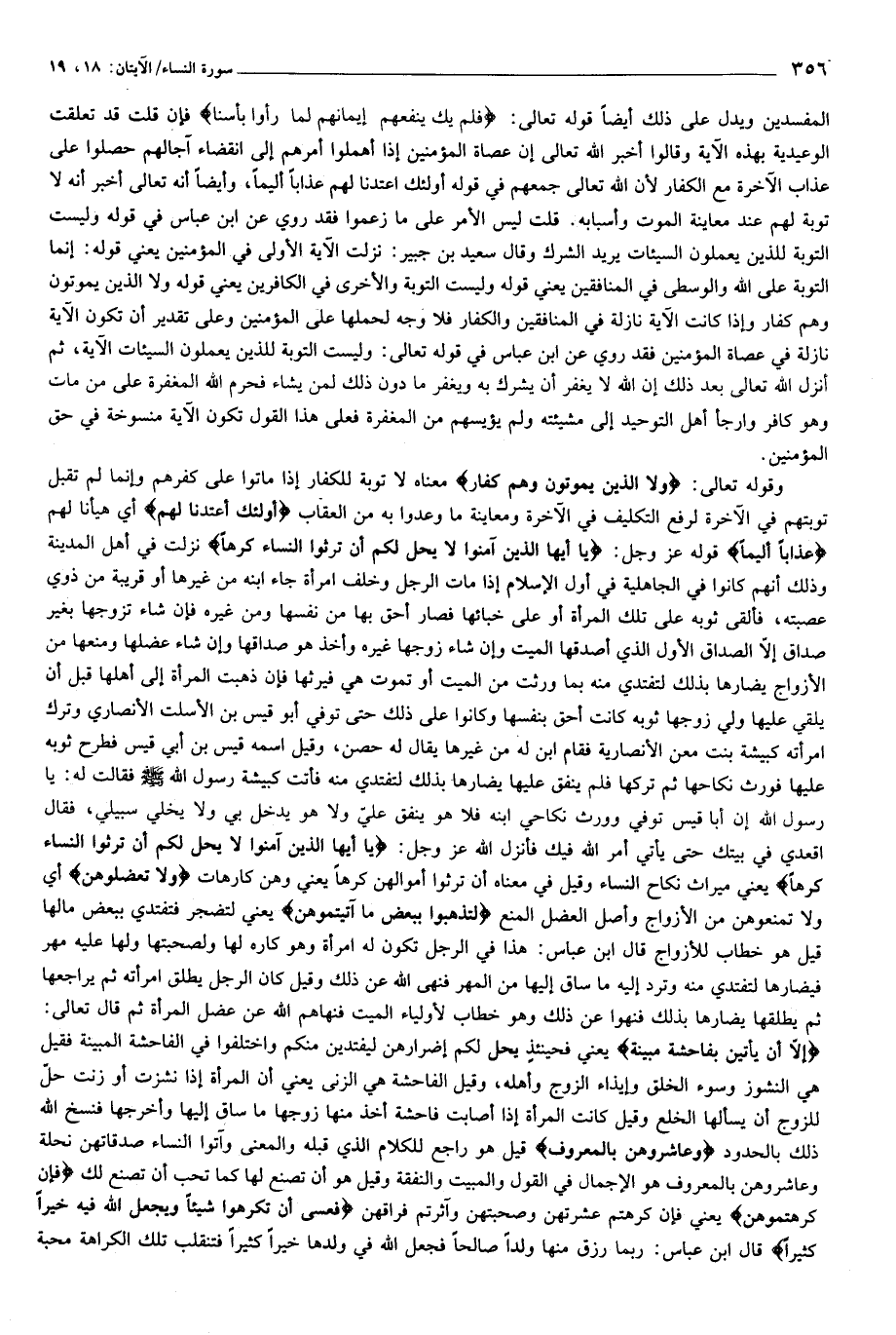 وقوله تعالى: وَلَا الَّذِينَ يَمُوتُونَ وَهُمْ كُفَّارٌ معناه لا توبة للكفار إذا ماتوا على كفرهم وإنما لم تقبل توبتهم في الآخرة لرفع التكليف في الآخرة ومعاينة ما وعدوا به من العقاب أُولئِكَ أَعْتَدْنا لَهُمْ أي هيأنا لهم عَذاباً أَلِيماً قوله عز وجل: يا أَيُّهَا الَّذِينَ آمَنُوا لا يَحِلُّ لَكُمْ أَنْ تَرِثُوا النِّساءَ كَرْهاً نزلت في أهل المدينة وذلك أنهم كانوا في الجاهلية في أول الإسلام إذا مات الرجل وخلف امرأة جاء ابنه من غيرها أو قريبة من ذوي عصبته، فألقى ثوبه على تلك المرأة أو على خبائها فصار أحق بها من نفسها ومن غيره فإن شاء تزوجها بغير صداق إلّا الصداق الأول الذي أصدقها الميت وإن شاء زوجها غيره وأخذ هو صداقها وإن شاء عضلها ومنعها من الأزواج يضارها بذلك لتفتدي منه بما ورثت من الميت أو تموت هي فيرثها فإن ذهبت المرأة إلى أهلها قبل أن يلقي عليها ولي زوجها ثوبه كانت أحق بنفسها وكانوا على ذلك حتى توفي أبو قيس بن الأسلت الأنصاري وترك امرأته كبيشة بنت معن الأنصارية فقام ابن له من غيرها يقال له حصن، وقيل اسمه قيس بن أبي قيس فطرح ثوبه عليها فورث نكاحها ثم تركها فلم ينفق عليها يضارها بذلك لتفتدي منه فأتت كبيشة رسول الله صلّى الله عليه وسلّم فقالت له: يا رسول الله إن أبا قيس توفي وورث نكاحي ابنه فلا هو ينفق عليّ ولا هو يدخل بي ولا يخلي سبيلي، فقال اقعدي في بيتك حتى يأتي أمر الله فيك فأنزل الله عز وجل: يا أَيُّهَا الَّذِينَ آمَنُوا لا يَحِلُّ لَكُمْ أَنْ تَرِثُوا النِّساءَ كَرْهاً يعني ميراث نكاح النساء وقيل في معناه أن ترثوا أموالهن كرها يعني وهن كارهات وَلا تَعْضُلُوهُنَّ أي ولا تمنعوهن من الأزواج وأصل العضل المنع لِتَذْهَبُوا بِبَعْضِ ما آتَيْتُمُوهُنَّ يعني لتضجر فتفتدي ببعض مالها قيل هو خطاب للأزواج قال ابن عباس: هذا في الرجل تكون له امرأة وهو كاره لها ولصحبتها ولها عليه مهر فيضارها لتفتدي منه وترد إليه ما ساق إليها من المهر فنهى الله عن ذلك وقيل كان الرجل يطلق امرأته ثم يراجعها ثم يطلقها يضارها بذلك فنهوا عن ذلك وهو خطاب لأولياء الميت فنهاهم الله عن عضل المرأة ثم قال تعالى: