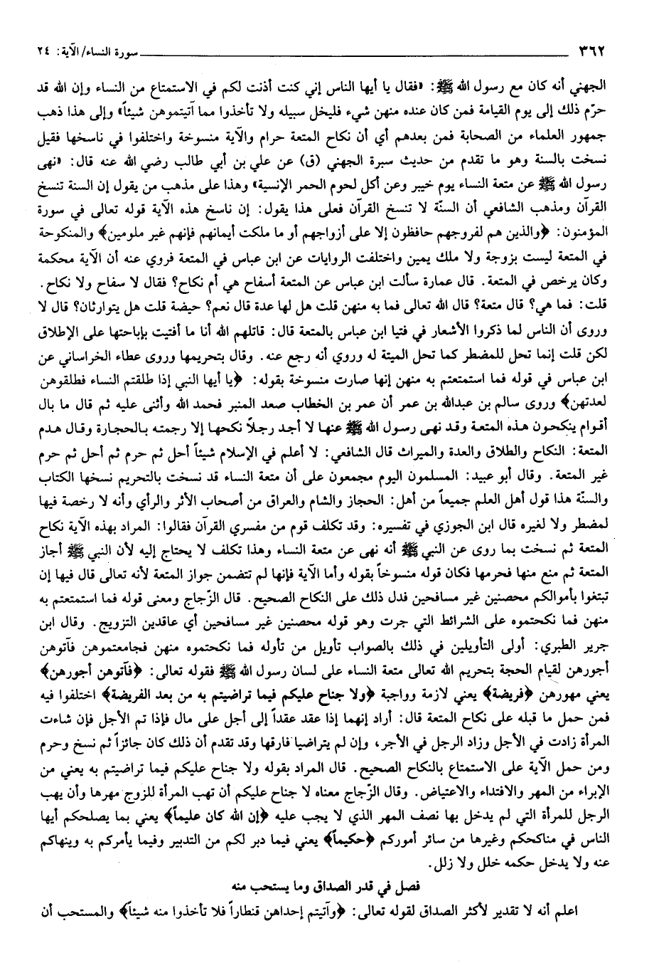 قلت: فما هي؟ قال متعة؟ قال الله تعالى فما به منهن قلت هل لها عدة قال نعم؟ حيضة قلت هل يتوارثان؟ قال لا وروى أن الناس لما ذكروا الأشعار في فتيا ابن عباس بالمتعة قال: قاتلهم الله أنا ما أفتيت بإباحتها على الإطلاق لكن قلت إنما تحل للمضطر كما تحل الميتة له وروي أنه رجع عنه. وقال بتحريمها وروى عطاء الخراساني عن ابن عباس في قوله فما استمتعتم به منهن إنها صارت منسوخة بقوله: يا أَيُّهَا النَّبِيُّ إِذا طَلَّقْتُمُ النِّساءَ فَطَلِّقُوهُنَّ لِعِدَّتِهِنَّ وروى سالم بن عبد الله بن عمر أن عمر بن الخطاب صعد المنبر فحمد الله وأثنى عليه ثم قال ما بال أقوام ينكحون هذه المتعة وقد نهى رسول الله صلّى الله عليه وسلّم عنها لا أجد رجلا نكحها إلا رجمته بالحجارة وقال هدم المتعة: النكاح والطلاق والعدة والميراث قال الشافعي: لا أعلم في الإسلام شيئا أحل ثم حرم ثم أحل ثم حرم غير المتعة. وقال أبو عبيد: المسلمون اليوم مجمعون على أن متعة النساء قد نسخت بالتحريم نسخها الكتاب والسنّة هذا قول أهل العلم جميعا من أهل: الحجاز والشام والعراق من أصحاب الأثر والرأي وأنه لا رخصة فيها لمضطر ولا لغيره قال ابن الجوزي في تفسيره: وقد تكلف قوم من مفسري القرآن فقالوا: المراد بهذه الآية نكاح المتعة ثم نسخت بما روى عن النبي صلّى الله عليه وسلّم أنه نهى عن متعة النساء وهذا تكلف لا يحتاج إليه لأن النبي صلّى الله عليه وسلّم أجاز المتعة ثم منع منها فحرمها فكان قوله منسوخا بقوله وأما الآية فإنها لم تتضمن جواز المتعة لأنه تعالى قال فيها إن تبتغوا بأموالكم محصنين غير مسافحين فدل ذلك على النكاح الصحيح. قال الزّجاج ومعنى قوله فما استمتعتم به منهن فما نكحتموه على الشرائط التي جرت وهو قوله محصنين غير مسافحين أي عاقدين التزويج. وقال ابن جرير الطبري: أولى التأويلين في ذلك بالصواب تأويل من تأوله فما نكحتموه منهن فجامعتموهن فآتوهن أجورهن لقيام الحجة بتحريم الله تعالى متعة النساء على لسان رسول الله صلّى الله عليه وسلّم فقوله تعالى: فَآتُوهُنَّ أُجُورَهُنَّ يعني مهورهن فَرِيضَةً يعني لازمة وواجبة وَلا جُناحَ عَلَيْكُمْ فِيما تَراضَيْتُمْ بِهِ مِنْ بَعْدِ الْفَرِيضَةِ اختلفوا فيه فمن حمل ما قبله على نكاح المتعة قال: أراد إنهما إذا عقد عقدا إلى أجل على مال فإذا تم الأجل فإن شاءت المرأة زادت في الأجل وزاد الرجل في الأجر، وإن لم يتراضيا فارقها وقد تقدم أن ذلك كان جائزا ثم نسخ وحرم ومن حمل الآية على الاستمتاع بالنكاح الصحيح. قال المراد بقوله ولا جناح عليكم فيما تراضيتم به يعني من الإبراء من المهر والافتداء والاعتياض. وقال الزّجاج معناه لا جناح عليكم أن تهب المرأة للزوج مهرها وأن يهب الرجل للمرأة التي لم يدخل بها نصف المهر الذي لا يجب عليه إِنَّ اللَّهَ كانَ عَلِيماً يعني بما يصلحكم أيها الناس في مناكحكم وغيرها من سائر أموركم حَكِيماً يعني فيما دبر لكم من التدبير وفيما يأمركم به وينهاكم عنه ولا يدخل حكمه خلل ولا زلل.