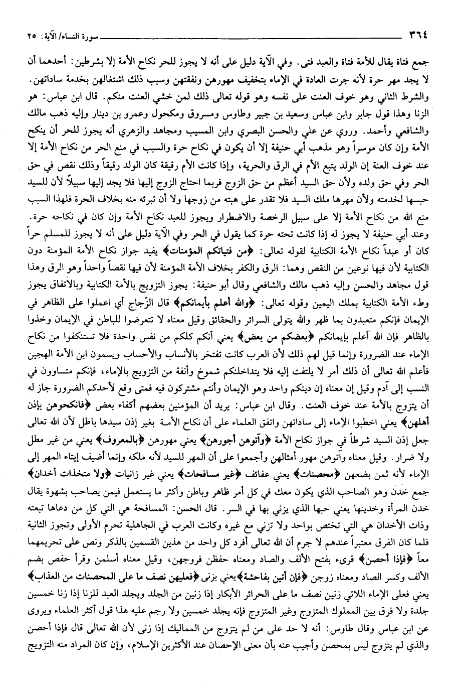 وعند أبي حنيفة لا يجوز له إذا كانت تحته حرة كما يقول في الحر وفي الآية دليل على أنه لا يجوز للمسلم حرا كان أو عبدا نكاح الأمة الكتابية لقوله تعالى: مِنْ فَتَياتِكُمُ الْمُؤْمِناتِ يفيد جواز نكاح الأمة المؤمنة دون الكتابية لأن فيها نوعين من النقص وهما: الرق والكفر بخلاف الأمة المؤمنة لأن فيها نقصا واحدا وهو الرق وهذا قول مجاهد والحسن وإليه ذهب مالك والشافعي وقال أبو حنيفة: يجوز التزويج بالأمة الكتابية وبالاتفاق يجوز وطء الأمة الكتابية بملك اليمين وقوله تعالى: وَاللَّهُ أَعْلَمُ بِإِيمانِكُمْ قال الزّجاج أي اعملوا على الظاهر في الإيمان فإنكم متعبدون بما ظهر والله يتولى السرائر والحقائق وقيل معناه لا تتعرضوا للباطن في الإيمان وخذوا بالظاهر فإن الله أعلم بإيمانكم بَعْضُكُمْ مِنْ بَعْضٍ يعني أنكم كلكم من نفس واحدة فلا تستنكفوا من نكاح الإماء عند الضرورة وإنما قيل لهم ذلك لأن العرب كانت تفتخر بالأنساب والأحساب ويسمون ابن الأمة الهجين فأعلم الله تعالى أن ذلك أمر لا يلتفت إليه فلا يتداخلنكم شموخ وأنفة من التزويج بالإماء، فإنكم متساوون في النسب إلى آدم وقيل إن معناه إن دينكم واحد وهو الإيمان وأنتم مشتركون فيه فمتى وقع لأحدكم الضرورة جاز له أن يتزوج بالأمة عند خوف العنت. وقال ابن عباس: يريد أن المؤمنين بعضهم أكفاء بعض فَانْكِحُوهُنَّ بِإِذْنِ أَهْلِهِنَّ يعني اخطبوا الإماء إلى ساداتهن واتفق العلماء على أن نكاح الأمة بغير إذن سيدها باطل لأن الله تعالى جعل إذن السيد شرطا في جواز نكاح الأمة وَآتُوهُنَّ أُجُورَهُنَّ يعني مهورهن بِالْمَعْرُوفِ يعني من غير مطل ولا ضرار. وقيل معناه وآتوهن مهور أمثالهن وأجمعوا على أن المهر للسيد لأنه ملكه وإنما أضيف إيتاء المهر إلى الإماء لأنه ثمن بضعهن مُحْصَناتٍ يعني عفائف غَيْرَ مُسافِحاتٍ يعني غير زانيات وَلا مُتَّخِذاتِ أَخْدانٍ جمع خدن وهو الصاحب الذي يكون معك في كل أمر ظاهر وباطن وأكثر ما يستعمل فيمن يصاحب بشهوة يقال خدن المرأة وخدينها يعني حبها الذي يزني بها في السر. قال الحسن: المسافحة هي التي كل من دعاها تبعته وذات الأخدان هي التي تختص بواحد ولا تزني مع غيره وكانت العرب في الجاهلية تحرم الأولى وتجوز الثانية فلما كان الفرق معتبرا عندهم لا جرم أن الله تعالى أفرد كل واحد من هذين القسمين بالذكر ونص على تحريمهما معا فَإِذا أُحْصِنَّ قرئ بفتح الألف والصاد ومعناه حفظن فروجهن، وقيل معناه أسلمن وقرأ حفص بضم الألف وكسر الصاد ومعناه زوجن فَإِنْ أَتَيْنَ بِفاحِشَةٍ يعني بزنى فَعَلَيْهِنَّ نِصْفُ ما عَلَى الْمُحْصَناتِ مِنَ الْعَذابِ يعني فعلى الإماء اللاتي زنين نصف ما على الحرائر الأبكار إذا زنين من الجلد ويجلد العبد للزنا إذا زنا خمسين جلدة ولا فرق بين المملوك المتزوج وغير المتزوج فإنه يجلد خمسين ولا رجم عليه هذا قول أكثر العلماء ويروى عن ابن عباس وقال طاوس: أنه لا حد على من لم يتزوج من المماليك إذا زنى لأن الله تعالى قال فإذا أحصن والذي لم يتزوج ليس بمحصن وأجيب عنه بأن معنى الإحصان عند الأكثرين الإسلام، وإن كان المراد منه التزويج