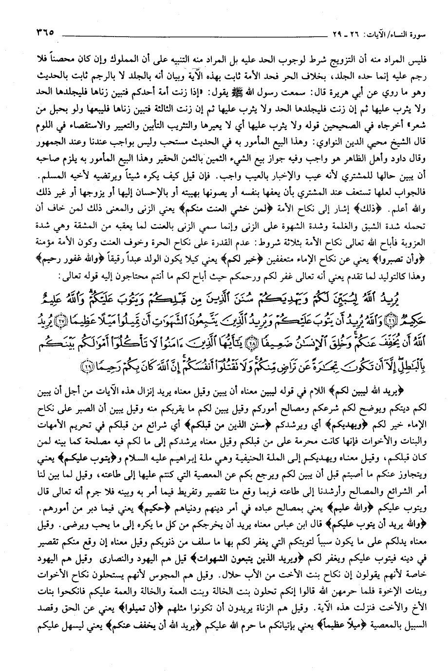 يُرِيدُ اللَّهُ لِيُبَيِّنَ لَكُمْ وَيَهْدِيَكُمْ سُنَنَ الَّذِينَ مِنْ قَبْلِكُمْ وَيَتُوبَ عَلَيْكُمْ وَاللَّهُ عَلِيمٌ حَكِيمٌ (26) وَاللَّهُ يُرِيدُ أَنْ يَتُوبَ عَلَيْكُمْ وَيُرِيدُ الَّذِينَ يَتَّبِعُونَ الشَّهَواتِ أَنْ تَمِيلُوا مَيْلاً عَظِيماً (27) يُرِيدُ اللَّهُ أَنْ يُخَفِّفَ عَنْكُمْ وَخُلِقَ الْإِنْسانُ ضَعِيفاً (28) يا أَيُّهَا الَّذِينَ آمَنُوا لا تَأْكُلُوا أَمْوالَكُمْ بَيْنَكُمْ بِالْباطِلِ إِلاَّ أَنْ تَكُونَ تِجارَةً عَنْ تَراضٍ مِنْكُمْ وَلا تَقْتُلُوا أَنْفُسَكُمْ إِنَّ اللَّهَ كانَ بِكُمْ رَحِيماً (29)