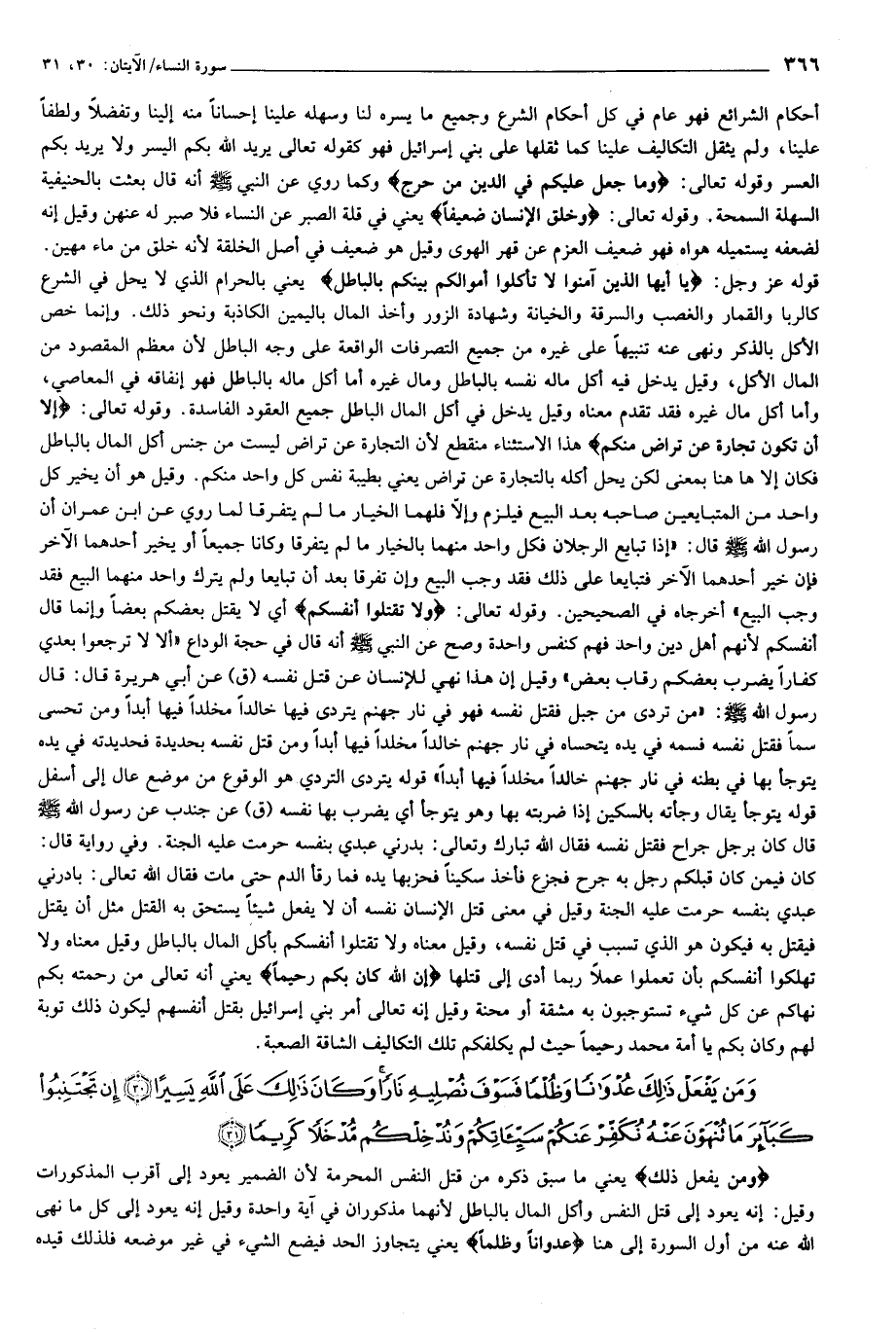 وَمَنْ يَفْعَلْ ذلِكَ عُدْواناً وَظُلْماً فَسَوْفَ نُصْلِيهِ ناراً وَكانَ ذلِكَ عَلَى اللَّهِ يَسِيراً (30) إِنْ تَجْتَنِبُوا كَبائِرَ ما تُنْهَوْنَ عَنْهُ نُكَفِّرْ عَنْكُمْ سَيِّئاتِكُمْ وَنُدْخِلْكُمْ مُدْخَلاً كَرِيماً (31)