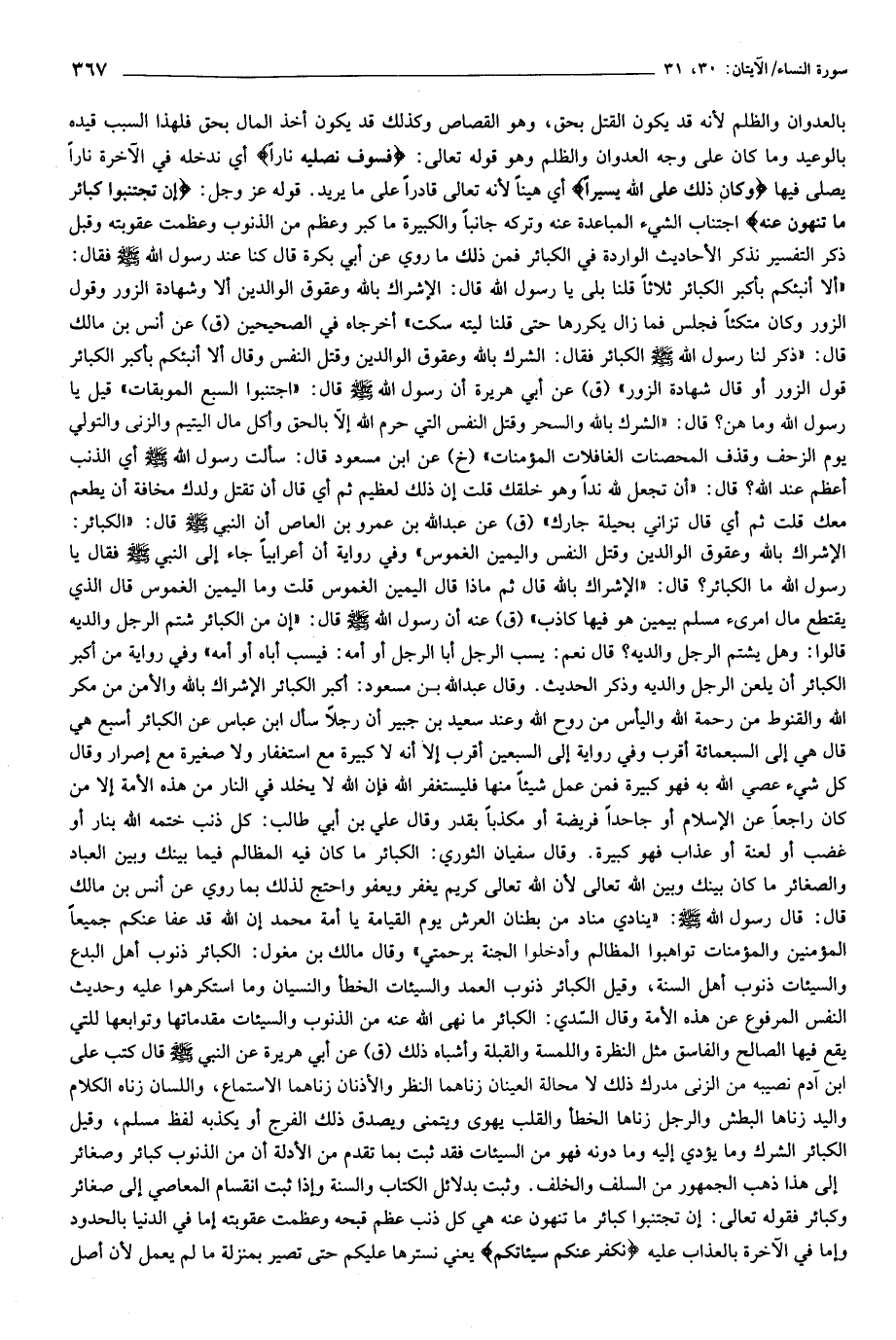 بالعدوان والظلم لأنه قد يكون القتل بحق، وهو القصاص وكذلك قد يكون أخذ المال بحق فلهذا السبب قيده بالوعيد وما كان على وجه العدوان والظلم وهو قوله تعالى: فَسَوْفَ نُصْلِيهِ ناراً أي ندخله في الآخرة نارا يصلى فيها وَكانَ ذلِكَ عَلَى اللَّهِ يَسِيراً أي هينا لأنه تعالى قادرا على ما يريد. قوله عز وجل: إِنْ تَجْتَنِبُوا كَبائِرَ ما تُنْهَوْنَ عَنْهُ اجتناب الشيء المباعدة عنه وتركه جانبا والكبيرة ما كبر وعظم من الذنوب وعظمت عقوبته وقبل ذكر التفسير نذكر الأحاديث الواردة في الكبائر فمن ذلك ما روي عن أبي بكرة قال كنا عند رسول الله صلّى الله عليه وسلّم فقال: