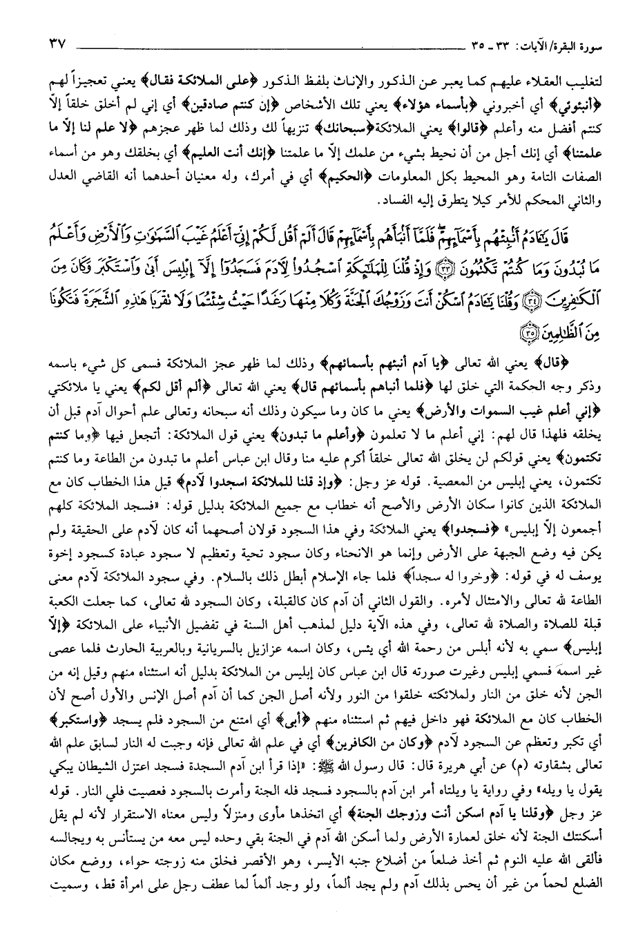 قالَ يا آدَمُ أَنْبِئْهُمْ بِأَسْمائِهِمْ فَلَمَّا أَنْبَأَهُمْ بِأَسْمائِهِمْ قالَ أَلَمْ أَقُلْ لَكُمْ إِنِّي أَعْلَمُ غَيْبَ السَّماواتِ وَالْأَرْضِ وَأَعْلَمُ ما تُبْدُونَ وَما كُنْتُمْ تَكْتُمُونَ (33) وَإِذْ قُلْنا لِلْمَلائِكَةِ اسْجُدُوا لِآدَمَ فَسَجَدُوا إِلاَّ إِبْلِيسَ أَبى وَاسْتَكْبَرَ وَكانَ مِنَ الْكافِرِينَ (34) وَقُلْنا يا آدَمُ اسْكُنْ أَنْتَ وَزَوْجُكَ الْجَنَّةَ وَكُلا مِنْها رَغَداً حَيْثُ شِئْتُما وَلا تَقْرَبا هذِهِ الشَّجَرَةَ فَتَكُونا مِنَ الظَّالِمِينَ (35)